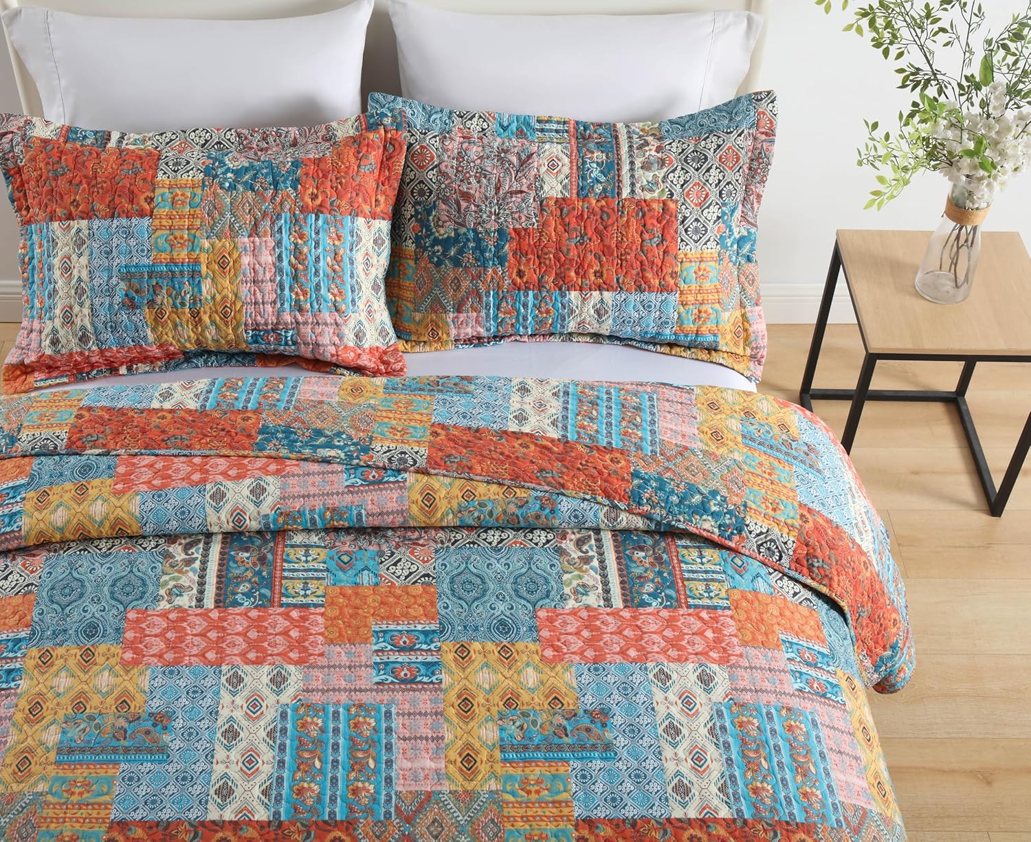 Cotton Bedspread Quilt Sets Reversible Coverlet Sets Comforters Vintage Bohemian Patchwork Bedspread,Orange,King Size