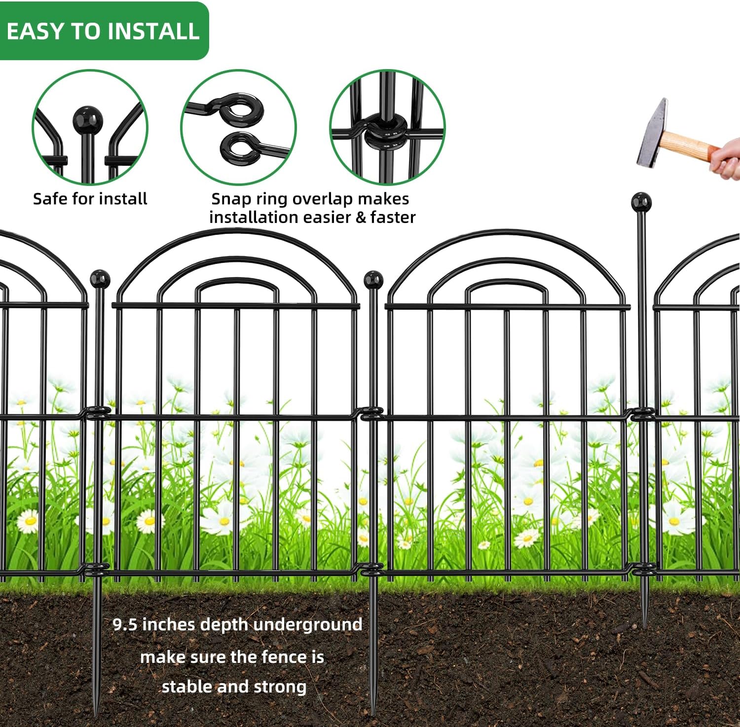 - Easy to Instal: Unique snap circle design eliminates the need for digging. Each yard fence panel board is designed with snap circles that can overlap each other. Simply overlap snap circles, insert the metal pole, and hammer them into the soil to secure them in place. Enjoy a beautiful and functional sturdy no dig fence.