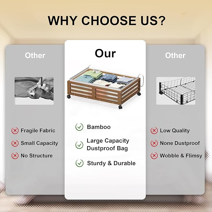 - 【360° Rotating Wheels】Features detachable wheels for easy sliding in and out from under the bed; convenient access in tight spaces