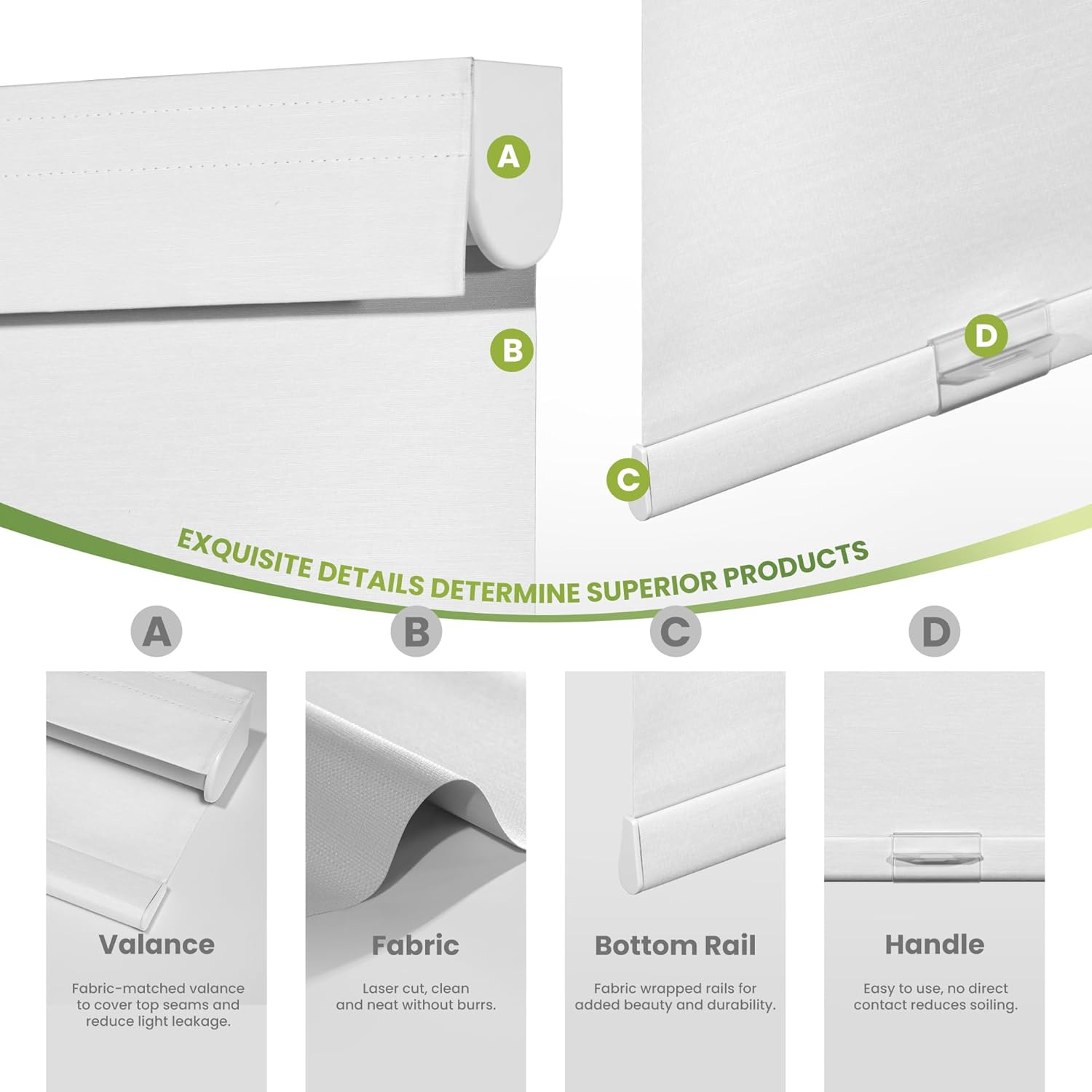 - [Quality Assurance] Professional roller shades production process, Upgraded generation of roller shades products, to give you the best-looking decorative effect. We offers 24 months guarantee, if you have problems in using our cordless roller shades, please contact us via Amazom mail. We will provide you with professional after-sales service.