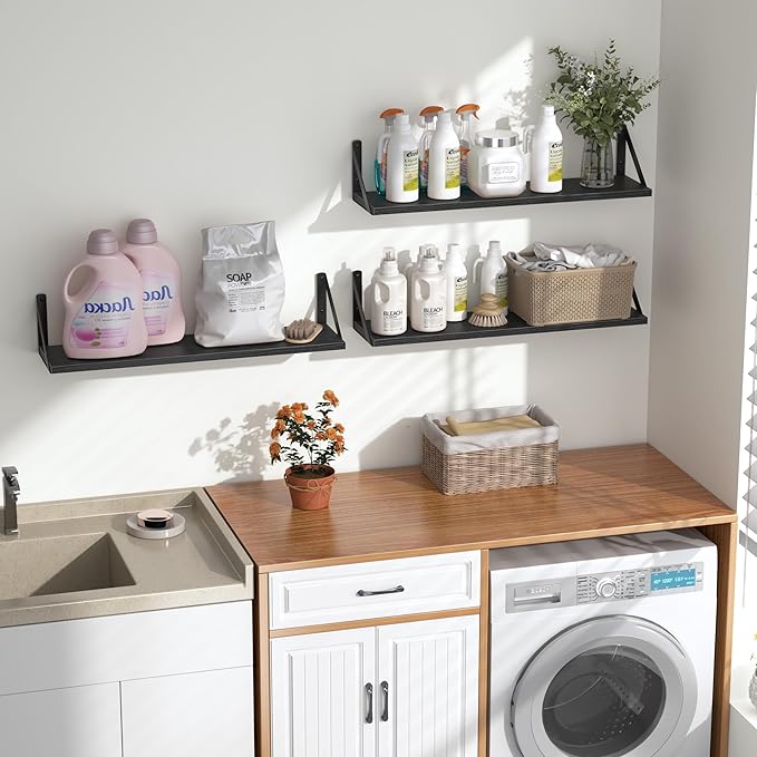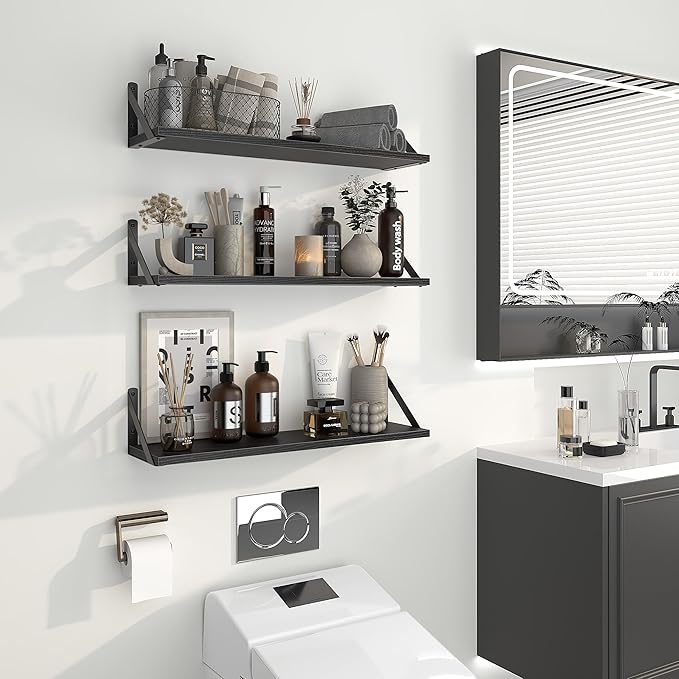 Heimlove Floating Shelves for Wall, 24 Inch Long Wood Floating Shelves Set of 3, Wall Mounted Hanging Shelf for Bathroom Bedroom Kitchen, Black