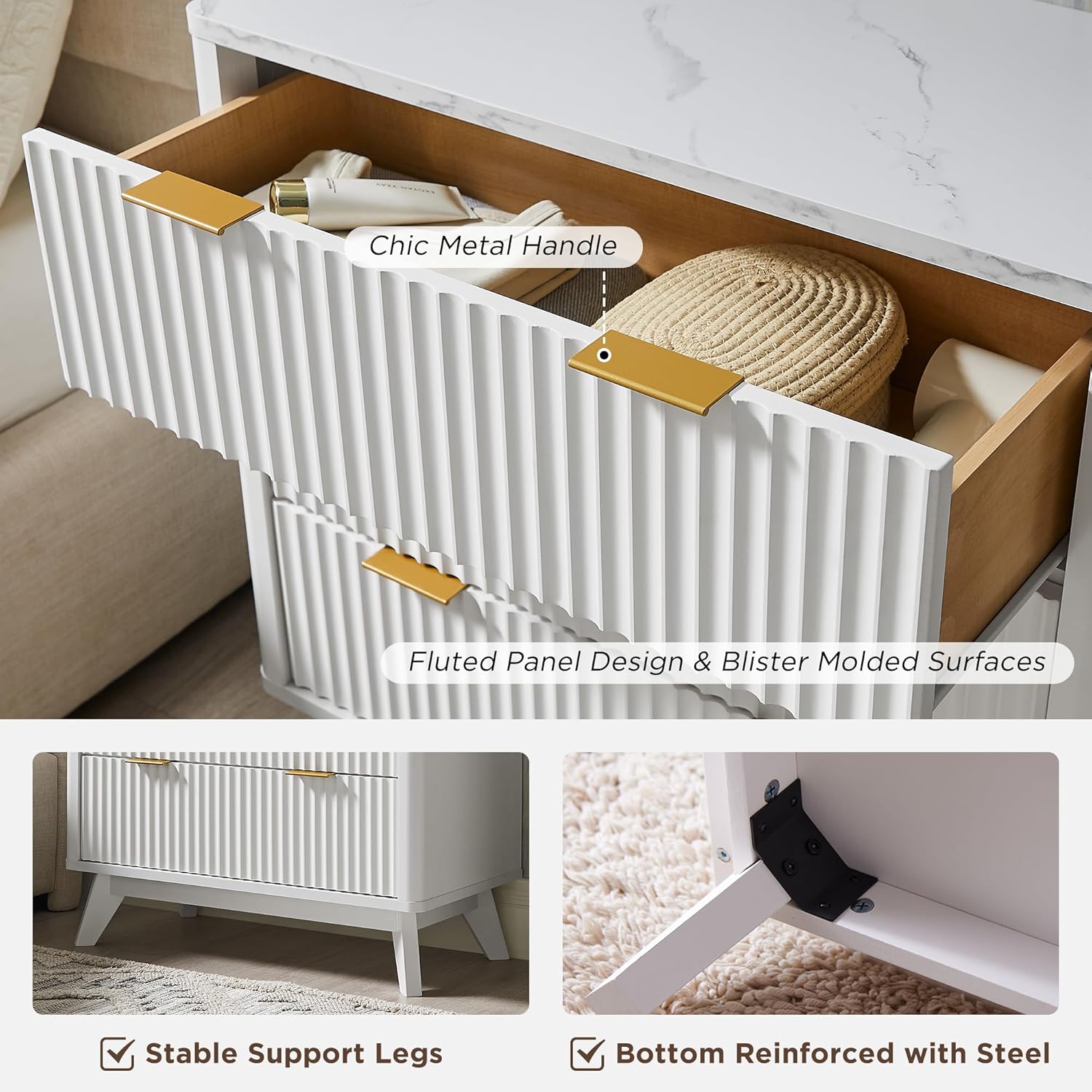 T4TREAM 32" Tall Fluted Nightstand Set of 2, Modern Side Table with Faux Marble Top, 3 Drawers End Table w/Storage, Bedside Table for Bedroom, Living Room, Curved Profile Design, Solid White