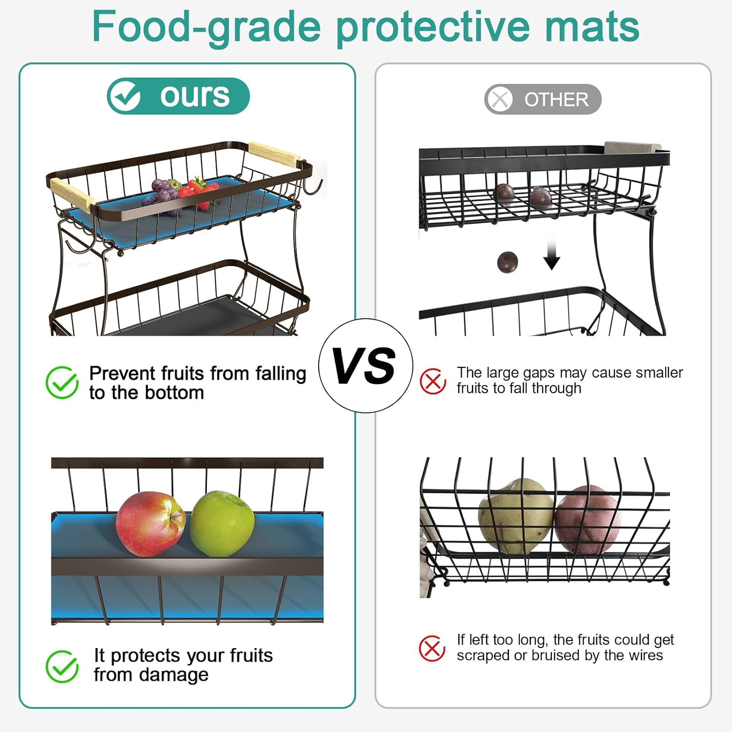 - Bonus mats prevent fruit from falling and protect against metal pressure marks.