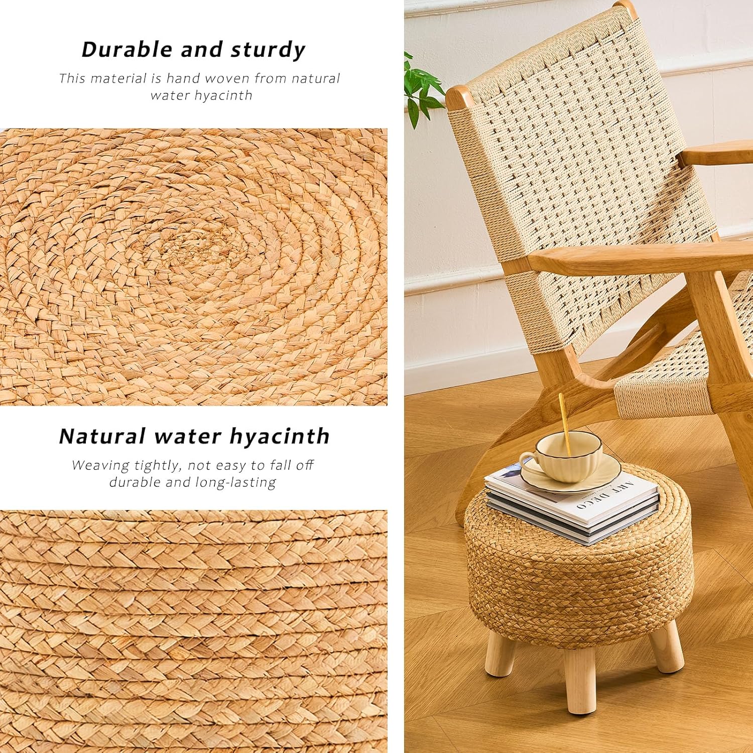 Handwoven Round Ottoman, Natural Water Hyacinth Outdoor Patio Pouf Seagrass Low Stool with Wood Legs, Soft Padded Footrest for Living Room Bedroom Garden, Natural