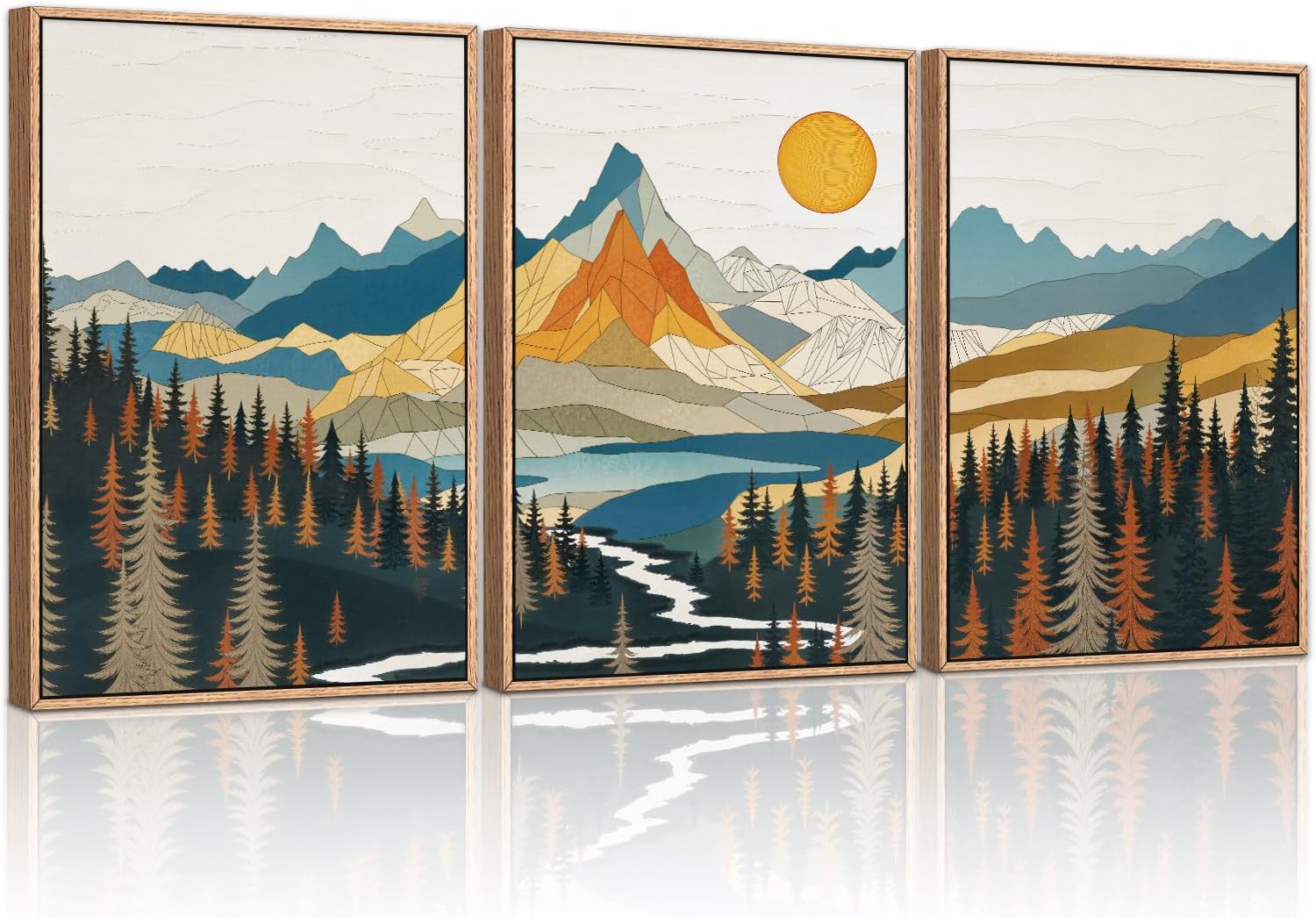- Mountain Sunset Wall Art: By painting natural elements such as mountains, forests, ponds, and sunsets on framed canvases and incorporating them into a modern design, this bohemian landscape set can create a space where nature and modern style coexist in harmony. The interplay of colors evokes feelings of joy and serenity, making this framed artwork the perfect addition to any space.