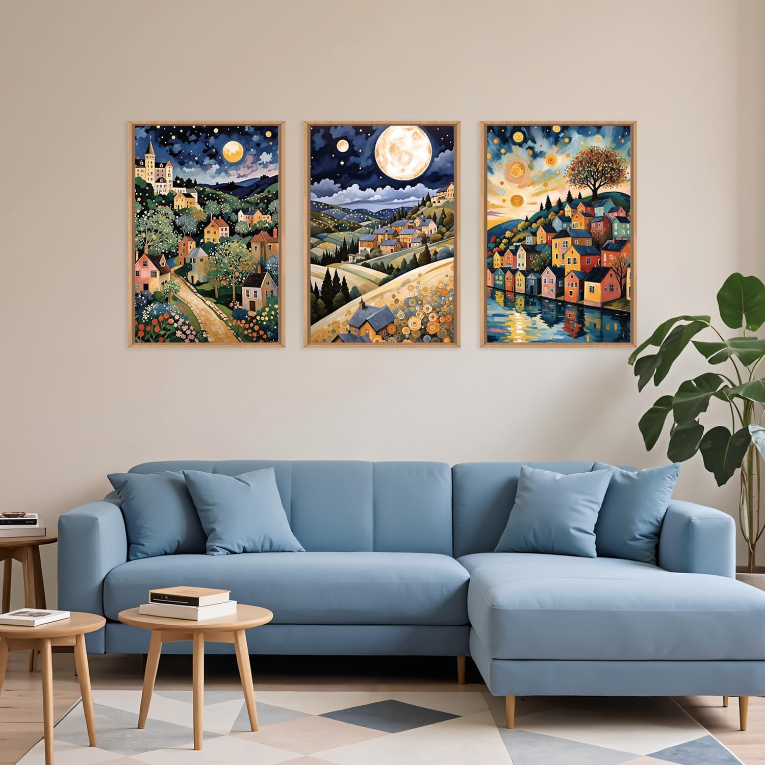 - 【Abstract Village Night Wall Art】A stunning multi-panel painting that captures the serene beauty of a charming town under the stars, with vibrant homes nestled in rolling hills. The artwork features rich colors and whimsical details that create a tranquil and inviting atmosphere.