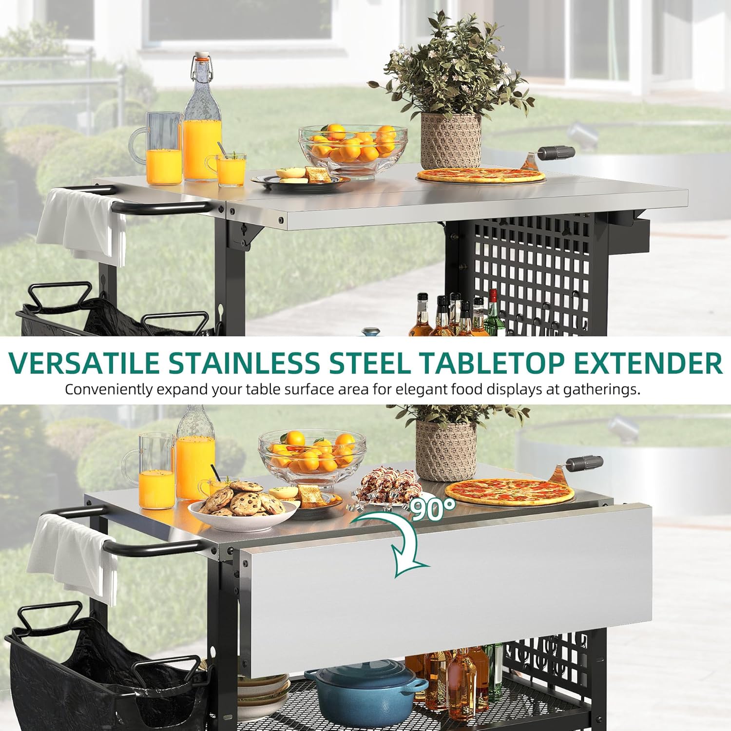 - Versatile Grill Cart for Expanded Entertaining: The drop leaf design extends the tabletop to 31.5" x 27.6", offering extra prep or serving space for grilling and hosting. Fold it down when not in use to save space, making it great for both large gatherings and compact patios