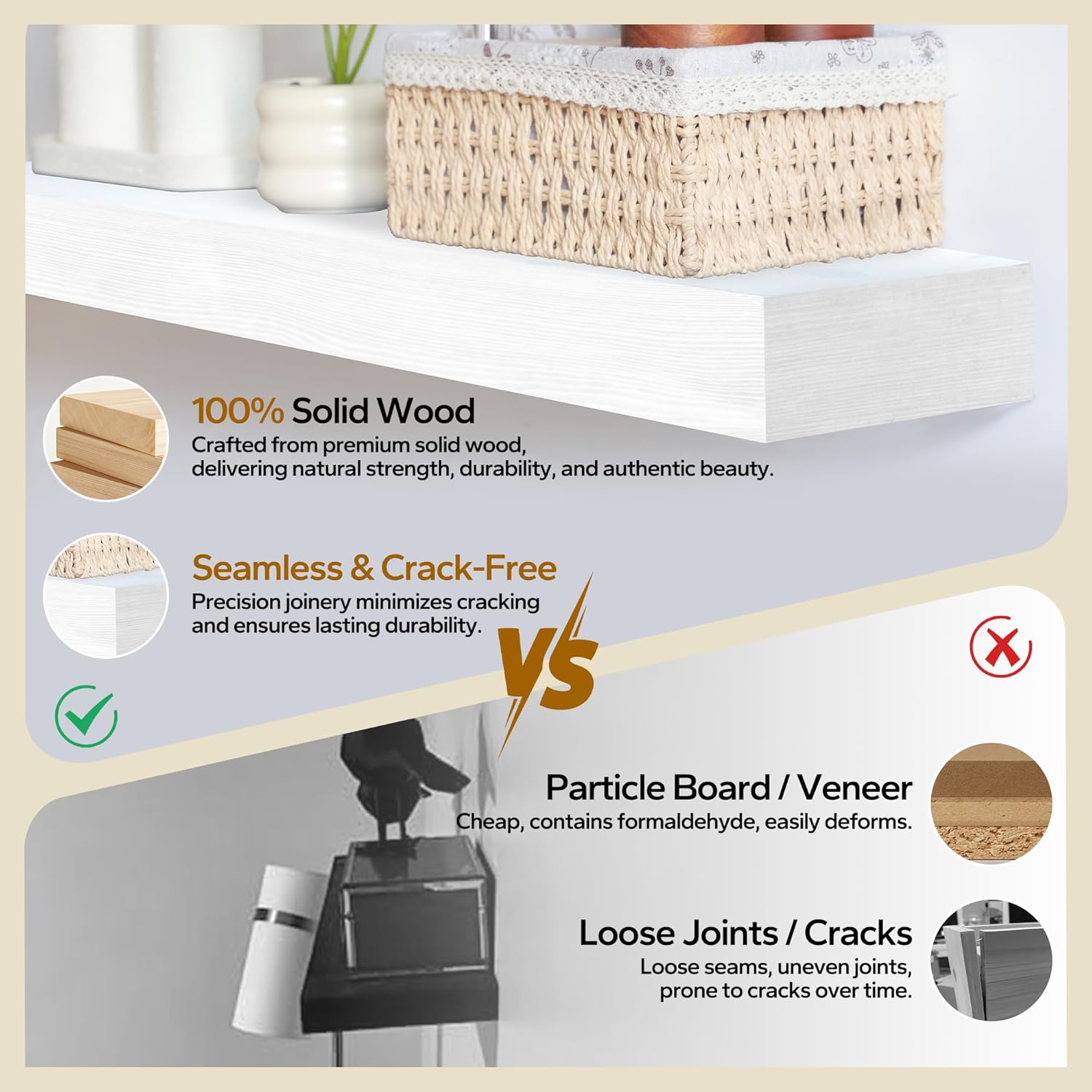 - Premium Handcrafted Solid Wood Shelves: Our floating shelves are made from 100% real solid pine wood, handcrafted to showcase the natural grain and unique knots of the wood. The rustic stain adds a timeless farmhouse charm, enhancing any home decor.