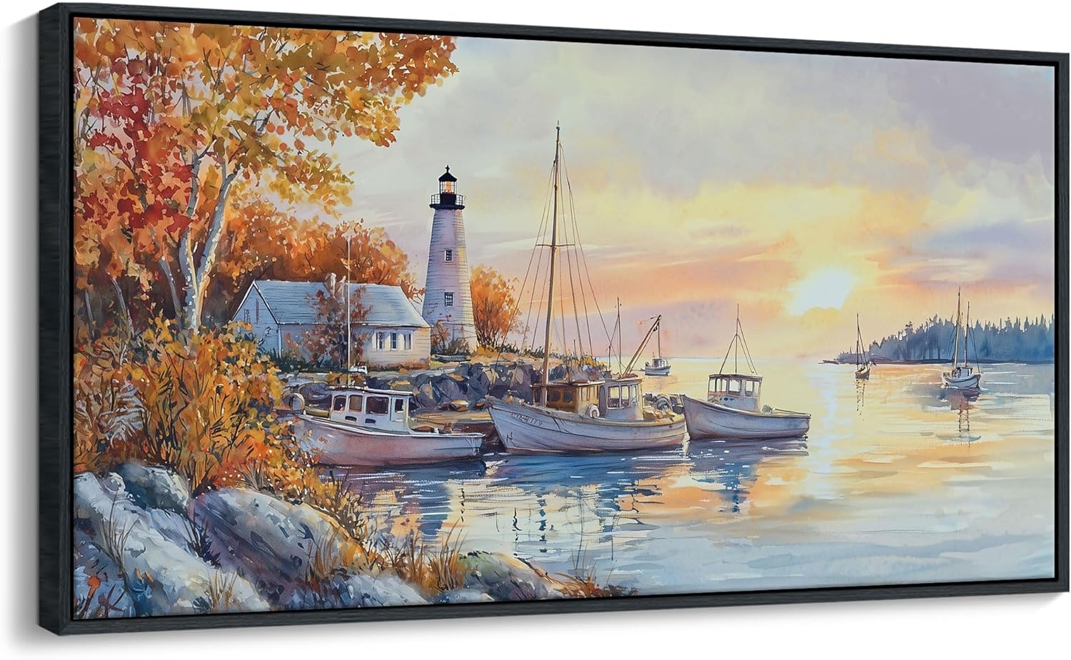 QZQCBLC Harbor Landscape Wall Art, Large Sunset Over the Sea Boat Gallery Pictures Artwork Modern Lighthouse Ocean View Paintings Framed for Living room Bedroom kitchen Home Office Decor 29x58 IN