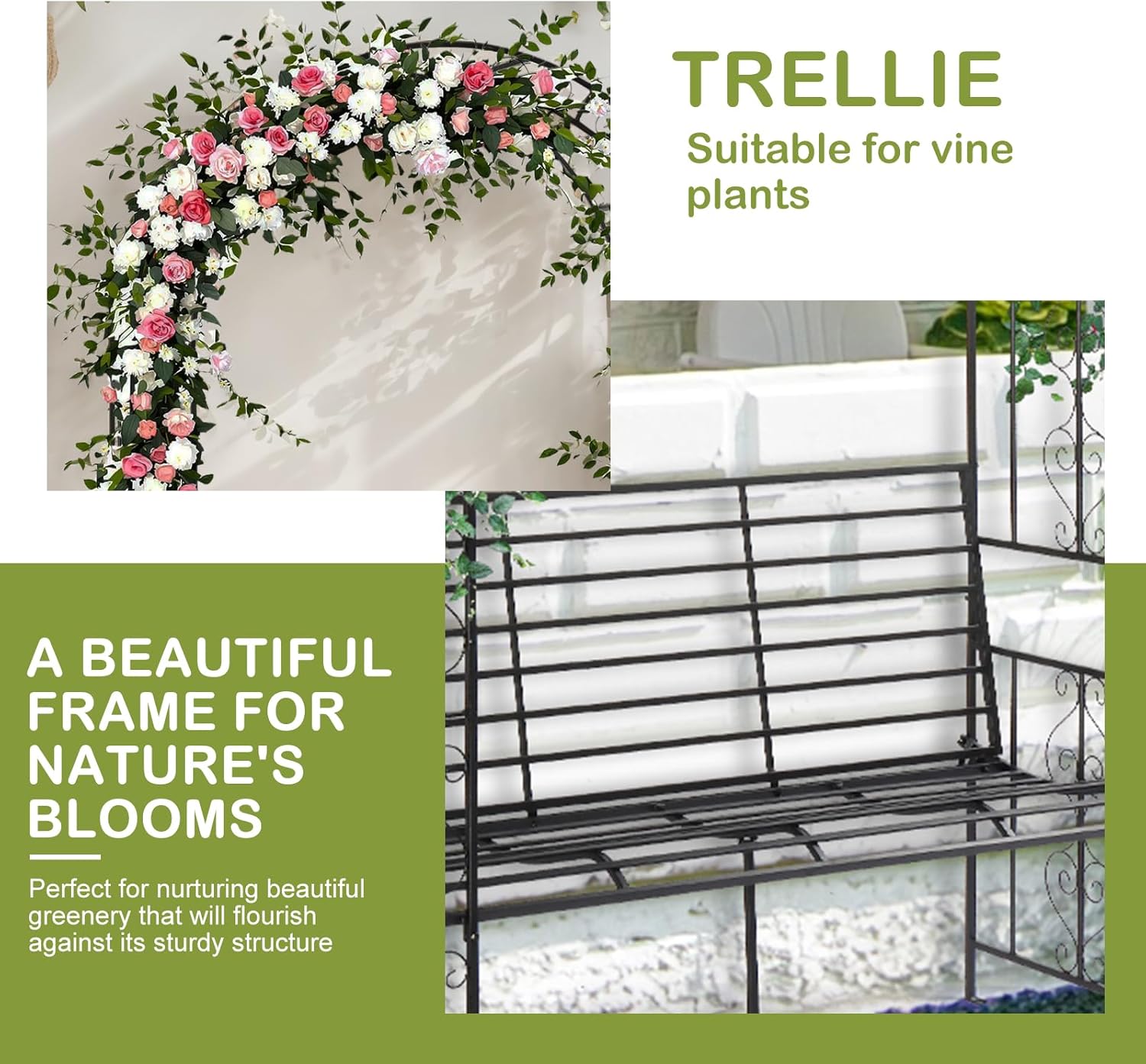 - 【Comfortable bench】According to ergonomics and test results, we designed the backrest of the bench to be inclined and the seat to be curved. Your body can lean against it with a relaxed feel. The heavy-duty iron frame structure has enough support to prevent the climbing trellis from tipping over. And there is also a support rod at the bottom of the chair to support the seat. You can use it with confidence