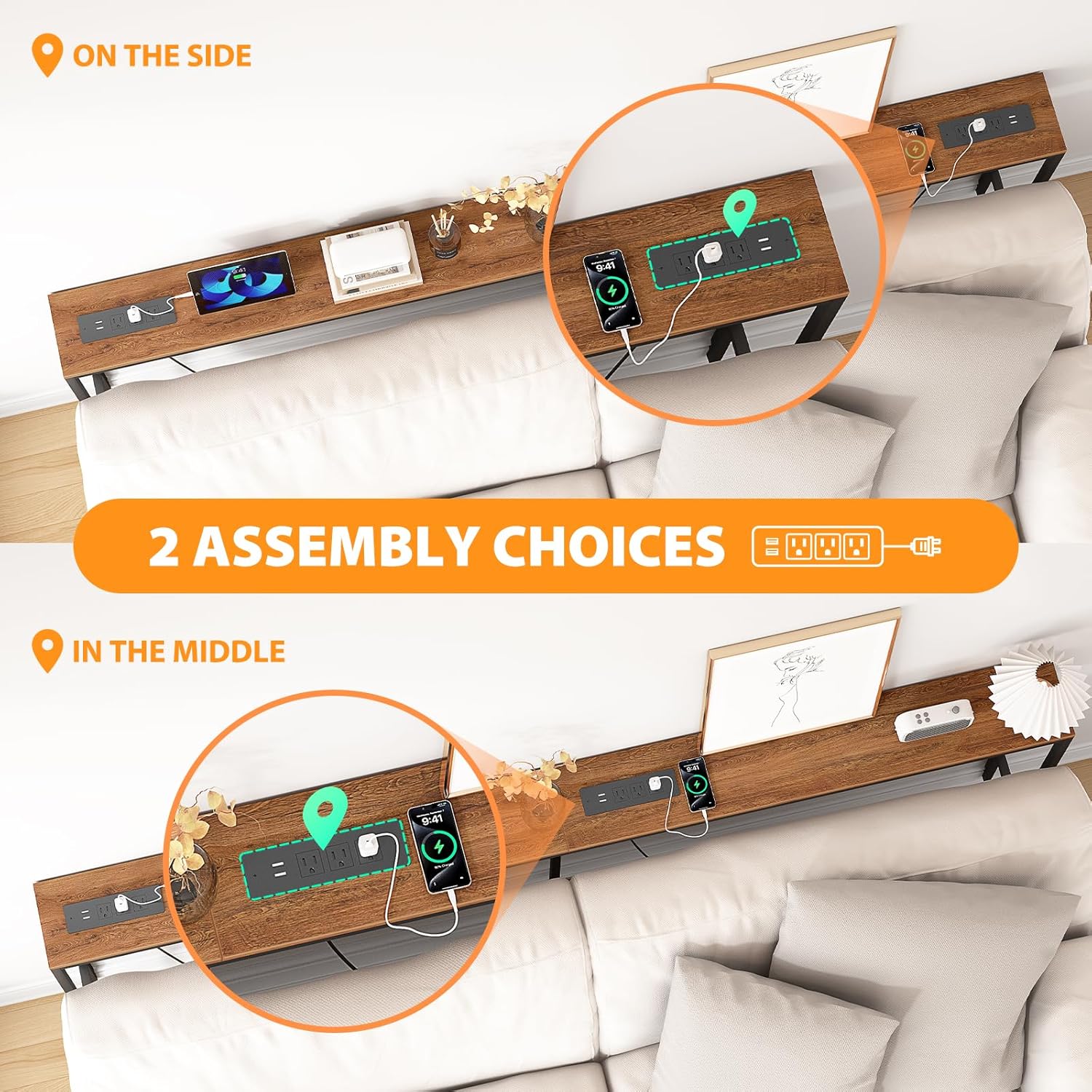 - Couch Table Behind Sofa with 2 Outlets: Narrow entryway table are equipped with 3 120VAC outlets, 2 USB ports and 4.9' long power cord with 5 cable ties. The desktop can adjust the power position as needed, which can effectively use the space behind the sofa to charge phones and laptops
