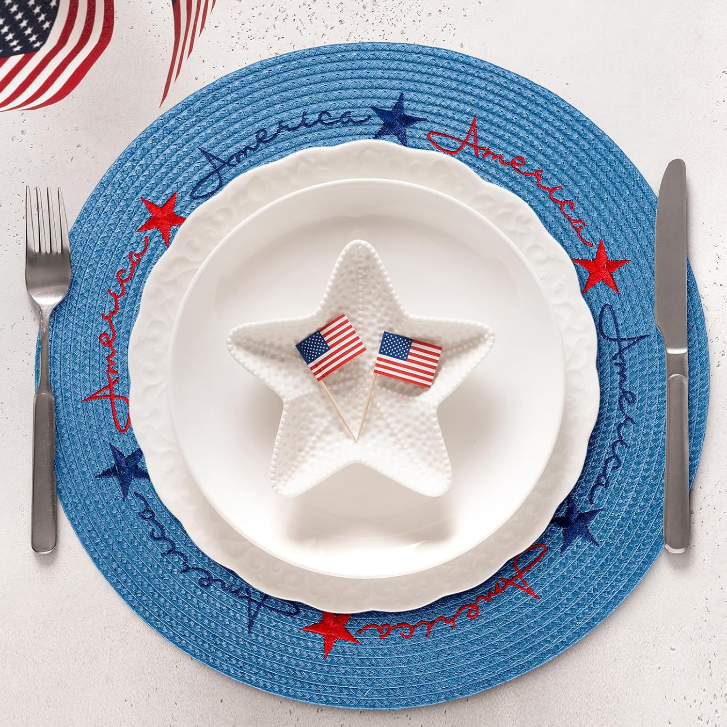 - Patriotic Design: Embroidered with red and blue stars patterns and the words American on a blue backdrop, quite suitable for your party and dining table decoration
