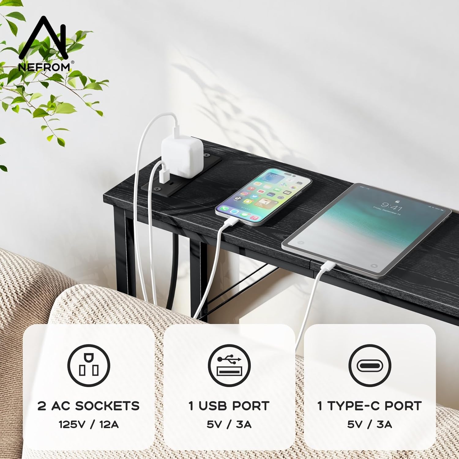 - 【CONSOLE TABLE WITH FAST-CHARGING STATION】---This size 7.9"D x 63"W x 31.5"H sofa table is equipped with 2 AC, 1 USB + 1 TYPE-C(5V 3A ) fast-charging ports, the power cord is 5 feet long, convenient to charge your mobile phone, computer, ipad.