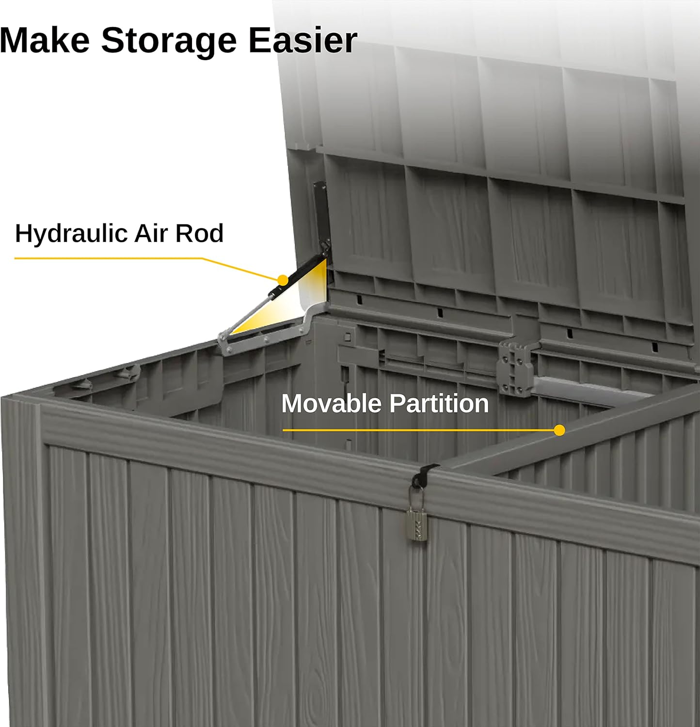- π¦πππ ππ‘π π¨π¦ππ₯-ππ₯πππ‘πππ¬ πππ¦πππ‘: Featuring a hydraulic lever mechanism, this outdoor storage box ensures smooth and safe operation, eliminating the risk of hand injuries. Inside, a detachable partition allows for organized, sectioned storage of your items.