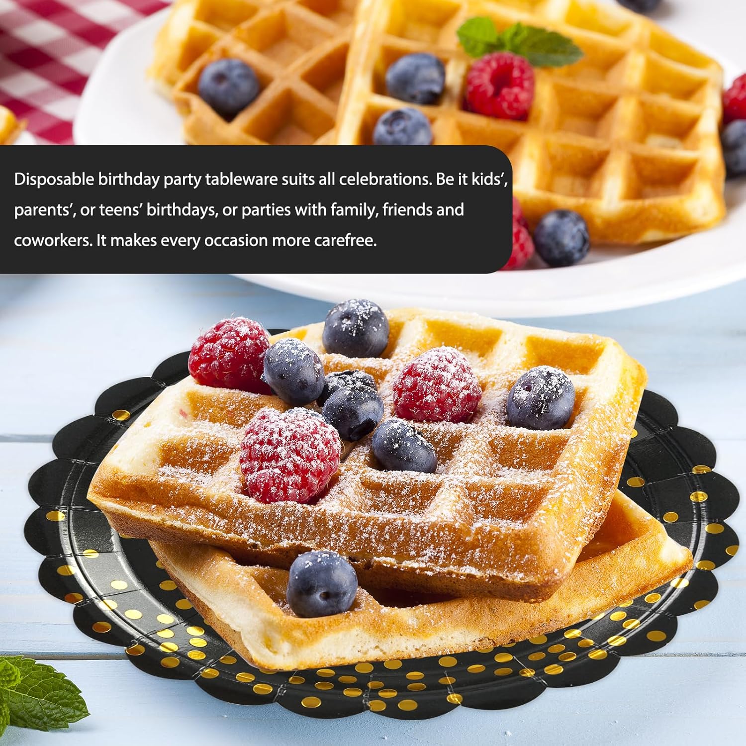 - 【SUPERIOR QUALITY】: Made from thick and food grade 350gsm heavy duty paper, environmentally friendly, odorless, heat resistant, these disposable black plates are strong enough to hold a variety of snacks, salads, and desserts without sagging or tearing. The surface is made of a waterproof membrane, so that your black and gold cake plates can be used with more peace of mind.