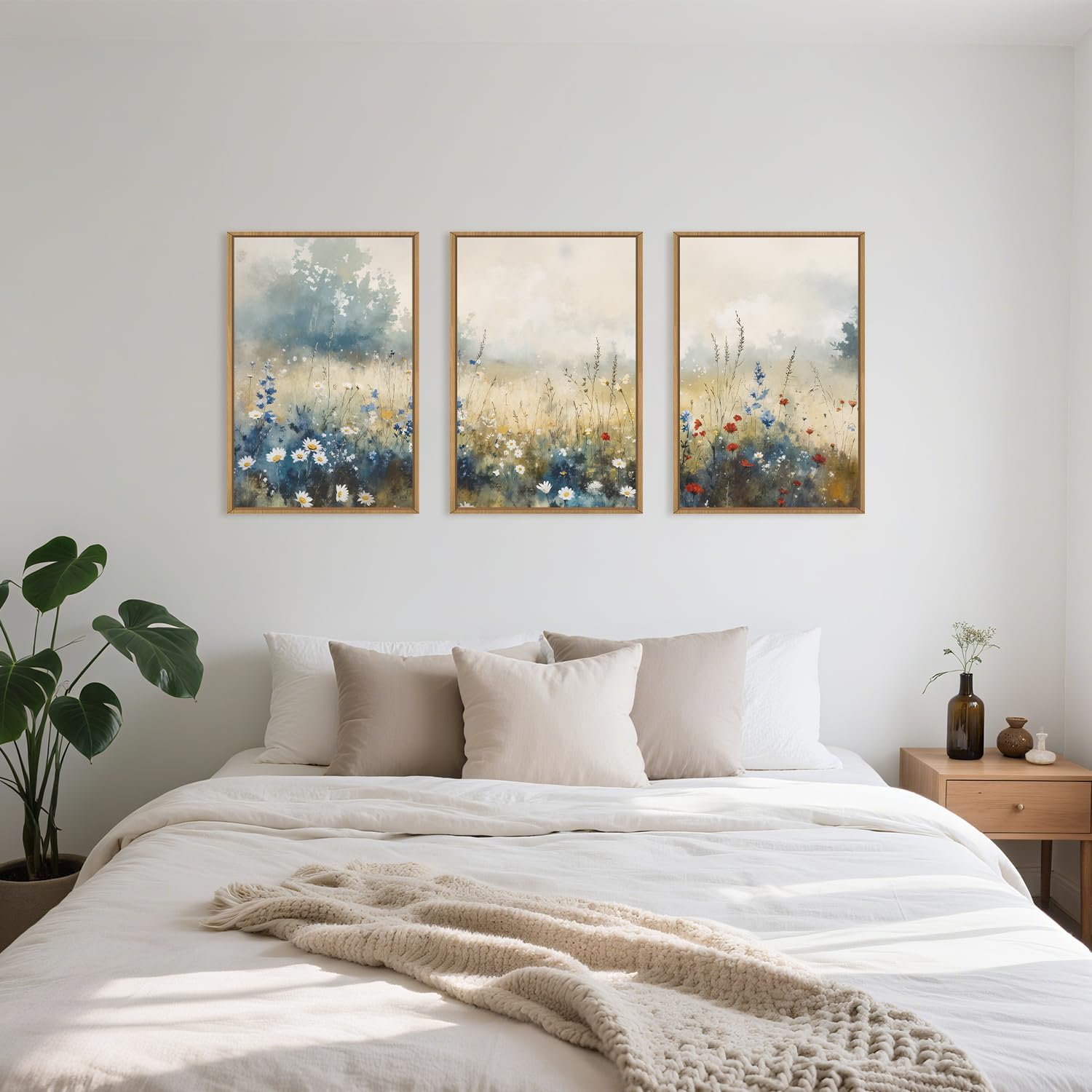 Nature Wildflower Framed Canvas Wall Art Set, Pastoral Landscape Wall Decor, Colorful Meadow Wall Painting, Rustic Floral Art Print for Living Room, Bedroom, Office - 16"X24"X3