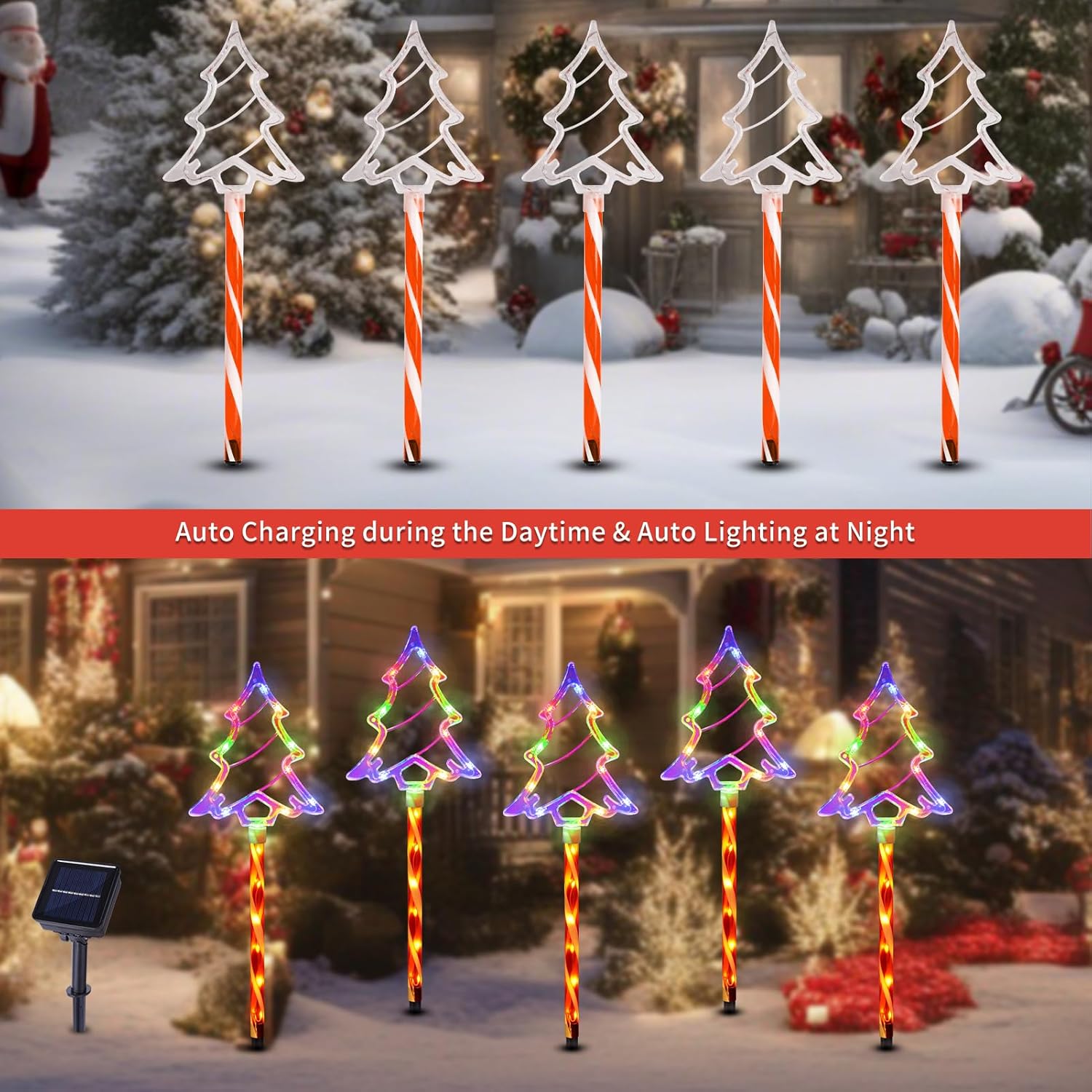 Christmas Solar Pathway Lights Outdoor Decorations, 8 Modes Xmas Tree Candy Lights Waterproof Led Garden Stake Light for Walkway Yard Lawn Porch Holiday Decor 5-Pack (Multicolor Tree, 5 Pack)