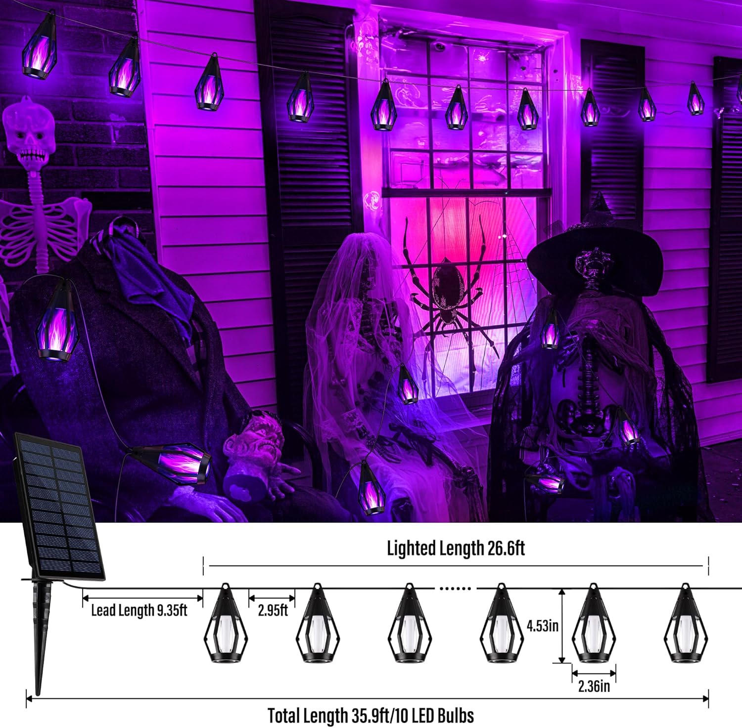 - Specifications: 26.6ft flame string lights with 10 LED bulbs, the lead wire is 9.35ft, total length is 35.9ft, and the bulb spacing is 2.95ft. Each bulb measuring 4.53inch in height and 2.36inch in width, creating a vibrant flickering flame effect perfect for spooky decorations