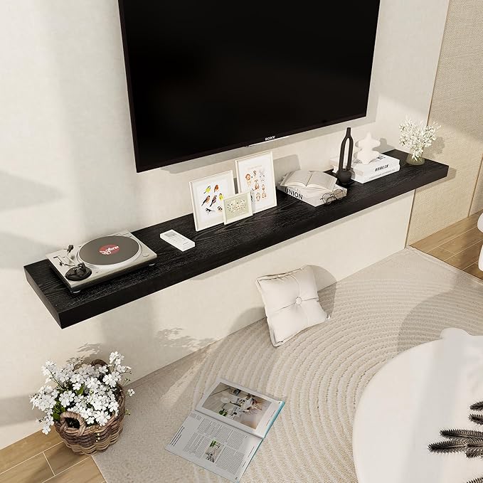 - 【12 INCH DEEP FLOATING SHELF】This extra deeper and thicker wall shelves are 12 inches in depth and 2 inches in thickness instead of the regular narrow floating shelves, you can put photos, pictures, DVD players, videos, books, toys, and some other knickknack on this beautiful display wooden shelf.