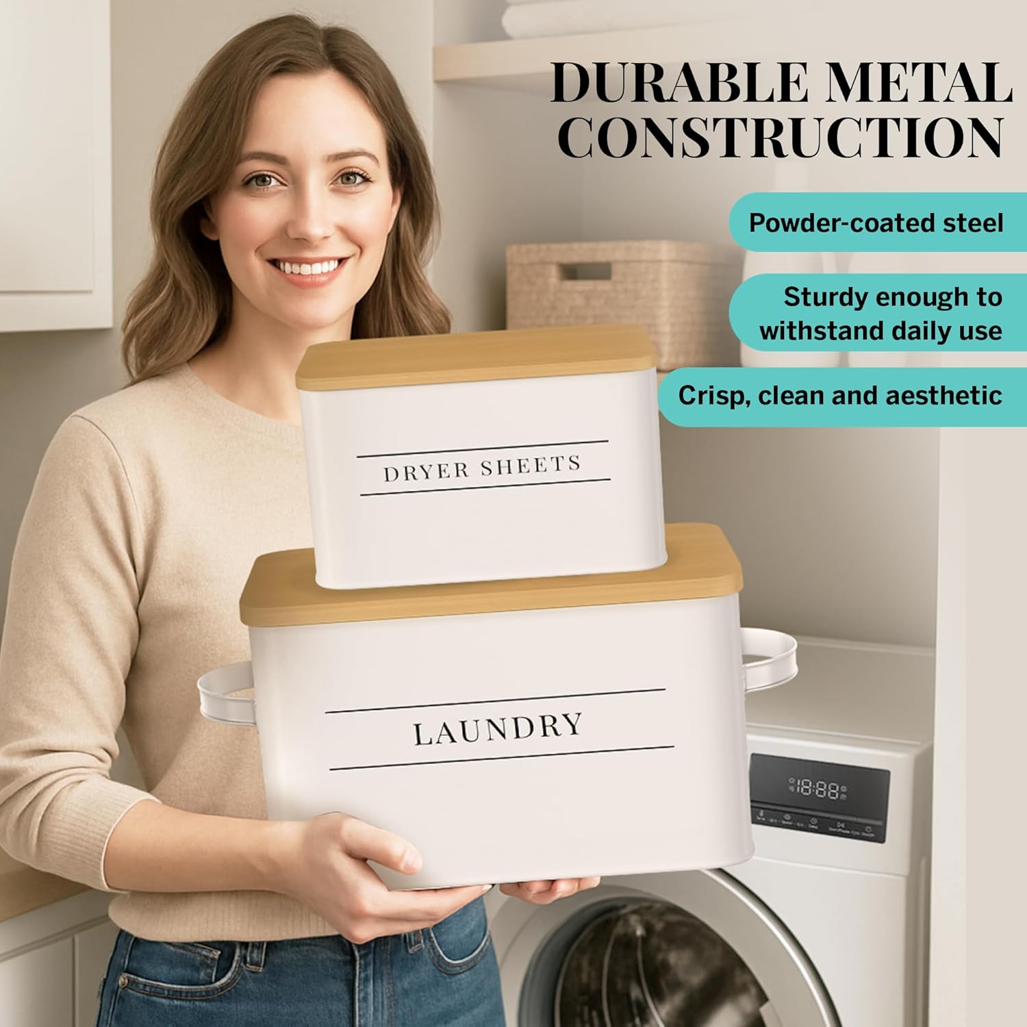 Metal Dryer Sheet Holder with Lid – Set of 2 Storage Bins for Laundry Room Organization & Home Decor – Classic White Metal Organizers and Containers with Lids - Sheet Organizers and Storage