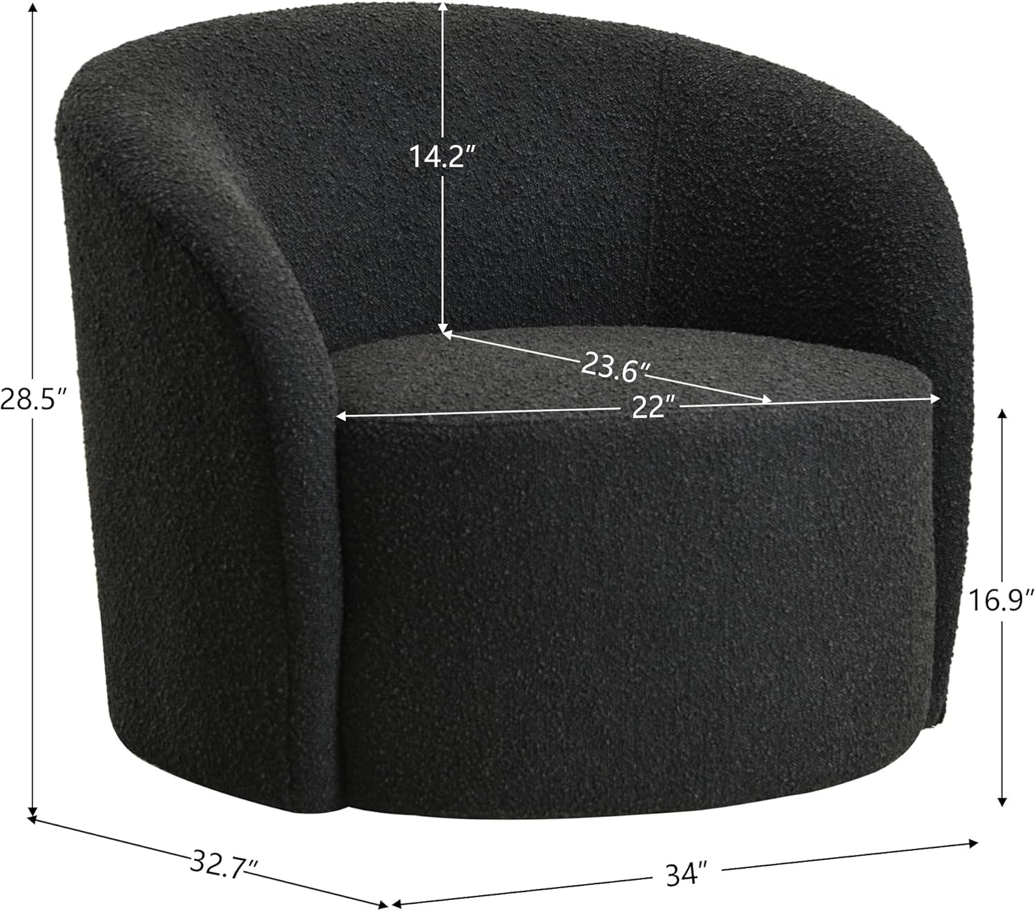 - 34-IN WIDENED BARREL CHAIR - It's different than the tiny 25.6-inch barrel chair size on the market. KINWELL boucle swivel barrel chair overall size: 32.7'' D X 34'' W X 28.5'' H. Weight: 49.3 lbs. With a seat size of 16.9'' H X 22'' W X 23.6'' D. The space is comfortable enough for an adult to read or rest.