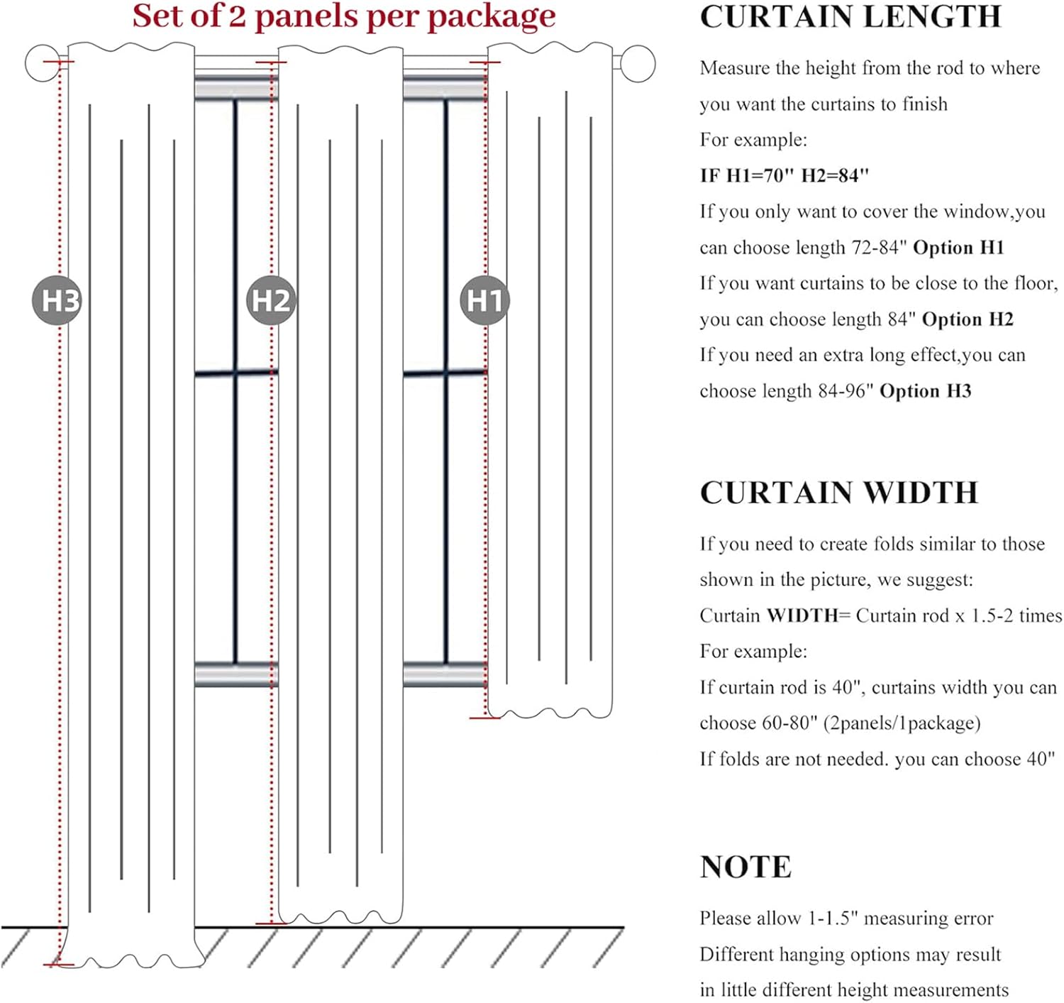 - Ready Made:Set of 2 pinch pleated curtain panels per package with 24 metal rings and 24 adjustable plastic hooks(The adjustable hook can raise and lower the height of the curtain by 1 inch),Each panel measures 70"W x 84"L,pair measures 140"W x 84"L