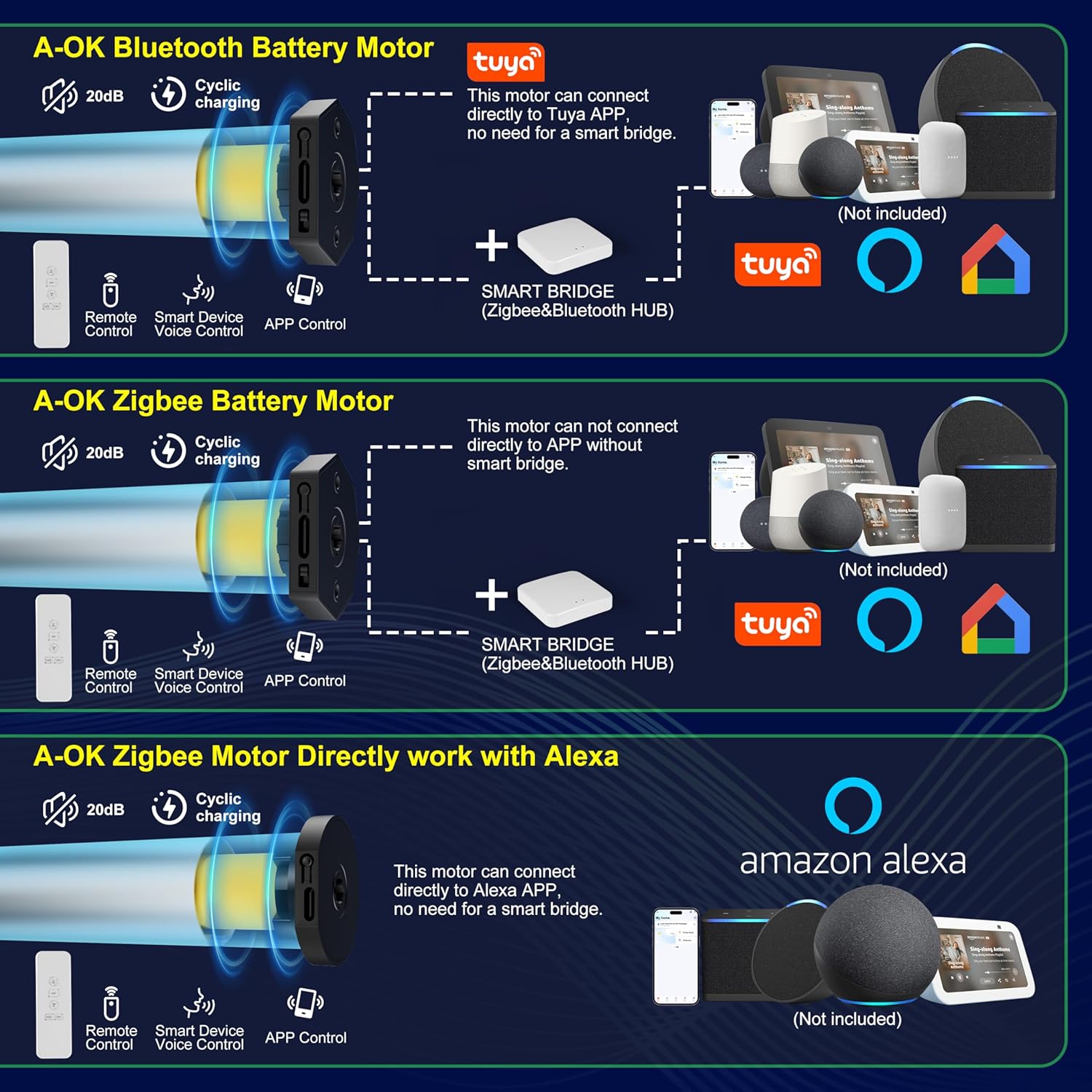 - 【Smart Motor】All smart motors can be controlled by remote control.【Zigbee motors】Smart roller blinds can be connected to Alexa and Google Home through smart bridge.【Bluetooth motors】Smart roller shades can be used directly with TUYA App,no need for smart bridge.【Amazon direct connect motors】Smart shades can be connected directly with Alexa.Stable connection, no signal interruption or delay.Let you experience the convenience and fun of smart life!