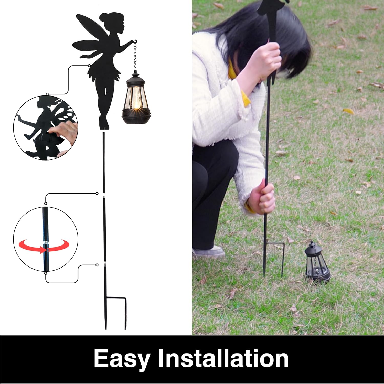 - 【 Tall Metal Solar Stakes 】Differing from other Fairy Statutes Solar lights for decoration, these angel figurines lights offer much taller height as 39 inch. The fairy garden kit comprises two straight poles with screws on both ends and one pole with a stake.