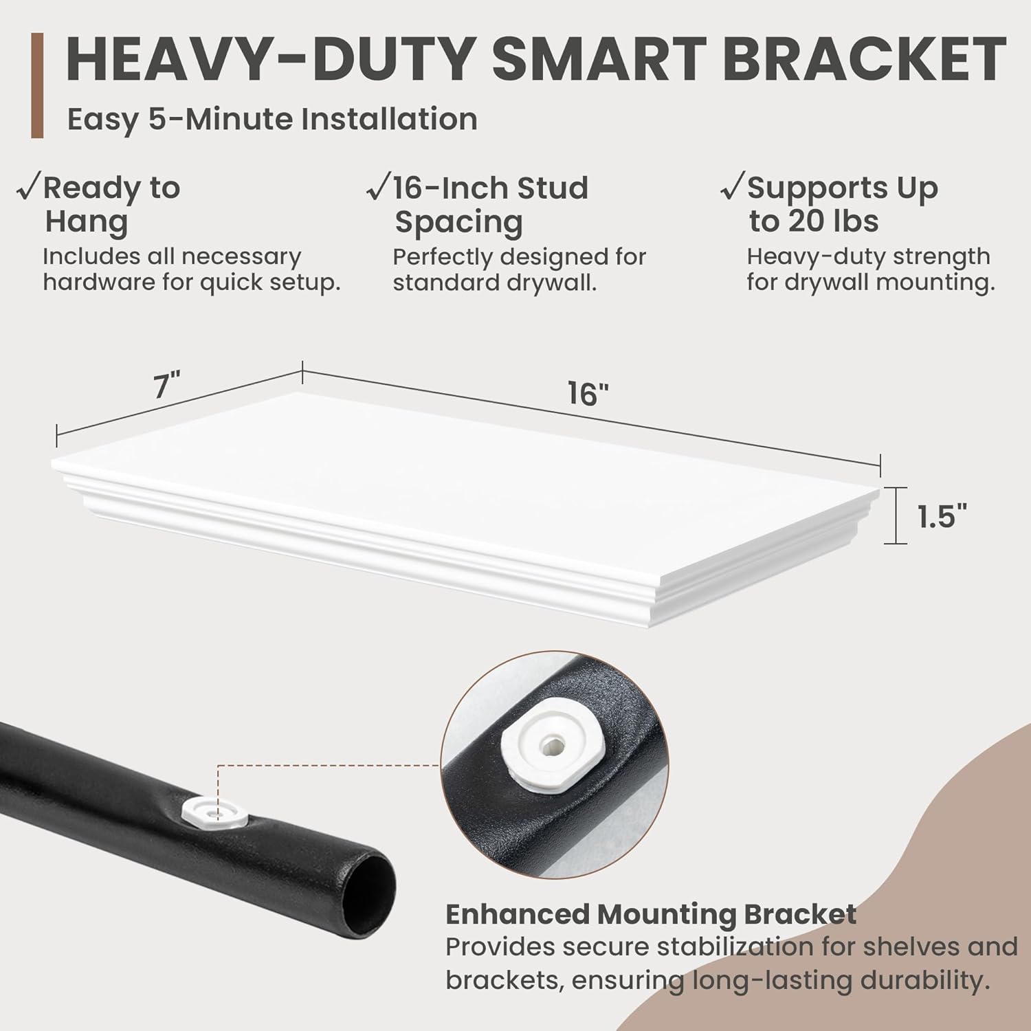 - Package Contents: 1 white floating shelf included, board dimension: 15.8" W x 6.9" D x 1.5" H. Other accessories: 1 metal brackets, 1 magnetic level, 3 wood iron connection screws, 6 wall screws and expansion tubes, and 1 installation manual