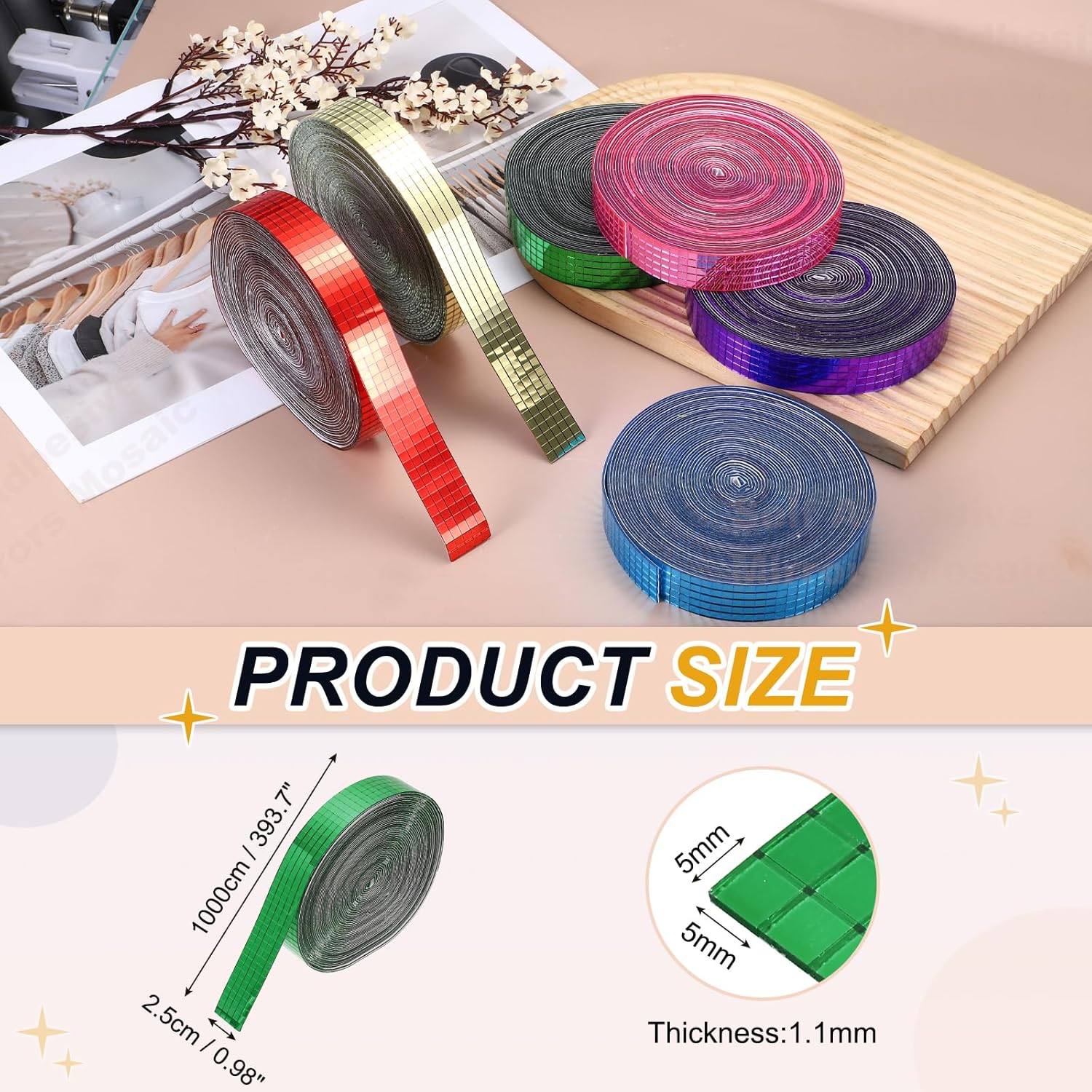 - Specification: Color: Green; Material: Glass; Size:1000x2.5cm/393.7x0.98Inch(LxW); Thickness:1.1mm/0.04inch; Each Tile Size: 5x5mm/0.2x0.2inch; Packing List: 10000 Pcs x Self Adhesive Mirrors Mosaic Tiles (Roll of 1)