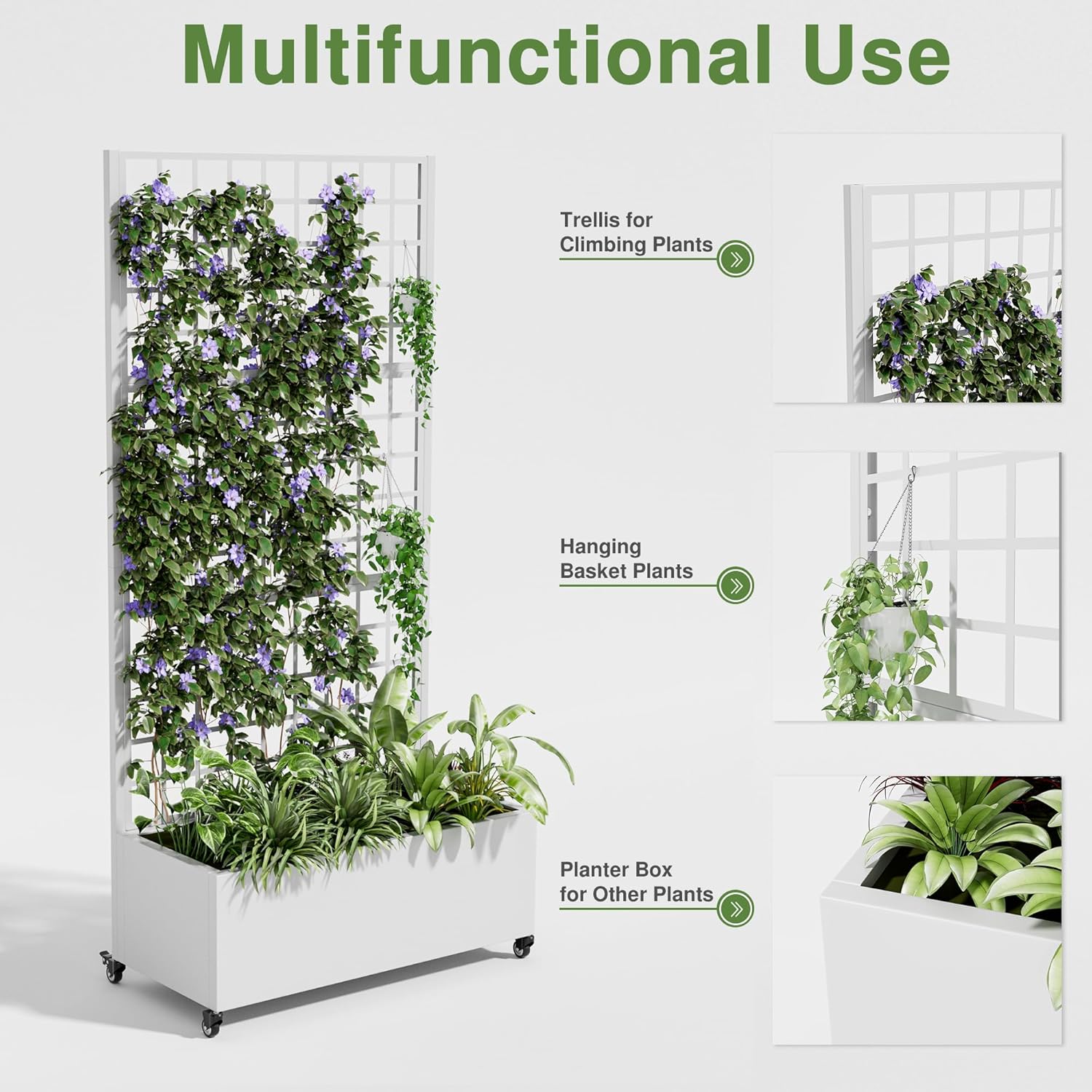 Casaphoria Metal Raised Garden Bed with Trellis and Wheels, 72"x35"x16" Planter Box for Climbing Plants, Vegetables & Vines, Features Drainage Holes and Privacy Screen (White-Square)
