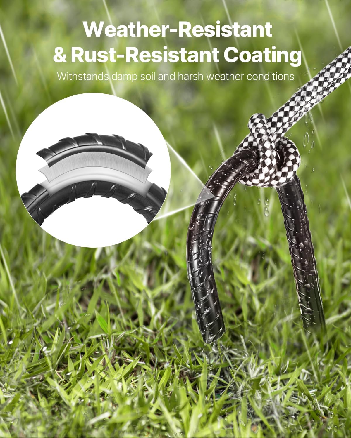 - Durable Galvanized Steel: Built with HRB400E galvanized steel core & black powder coating, these rebar stakes provide double rust protection. They maintain long-term strength while in harsh conditions like damp & salty-alkaline soil, and sun exposure