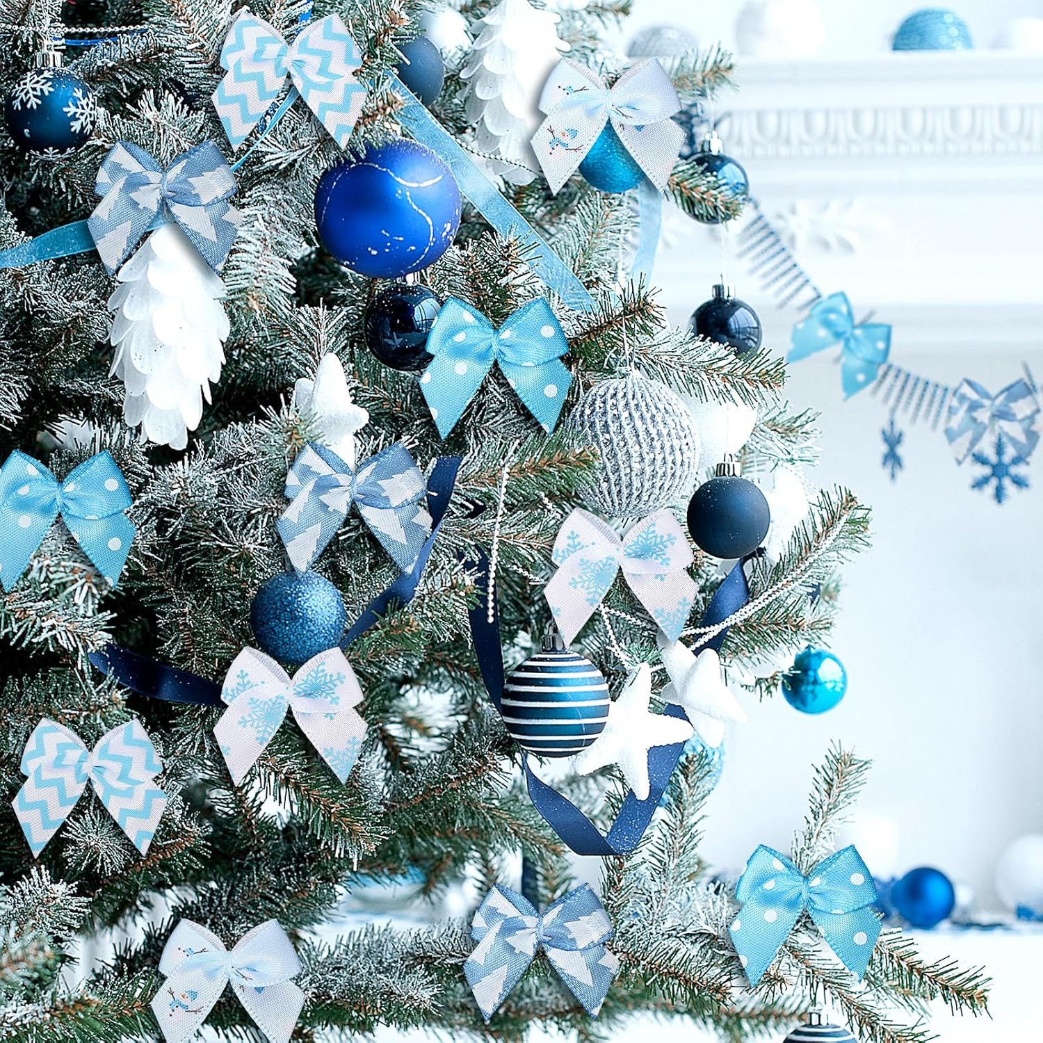 - Blue white themed: Our Christmas craft ribbon bow design is cute, with patterns of Christmas trees, snowmen, and snowflakes paired with polka dot and striped styles, as well as classic and fresh blue and white colors and mini shapes, giving people a delicate feeling and creating a stronger holiday atmosphere