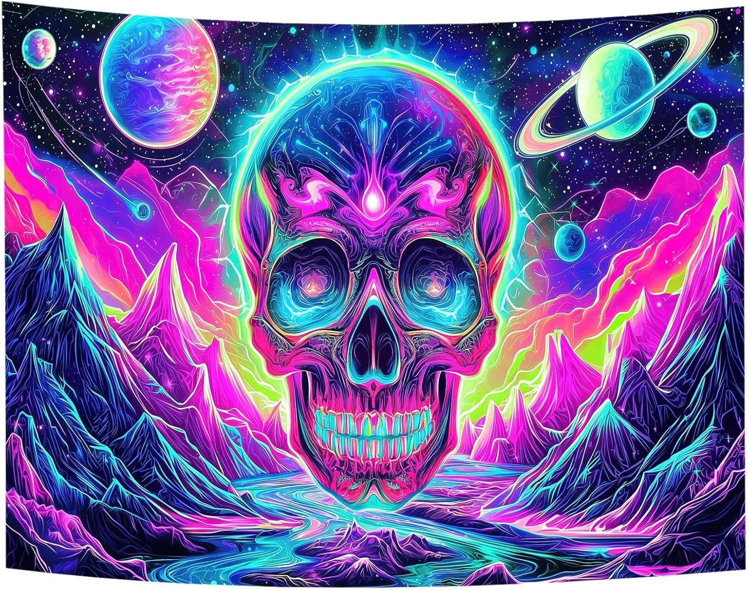 Blacklight Skull Tapestry, UV Reactive Gothic Skeleton Mountain Galaxy Planet Wall Hanging Tapestries, Glow in the Dark Horror Face Halloween Aesthetic Poster for Bedroom Living Room Decor 80X60IN