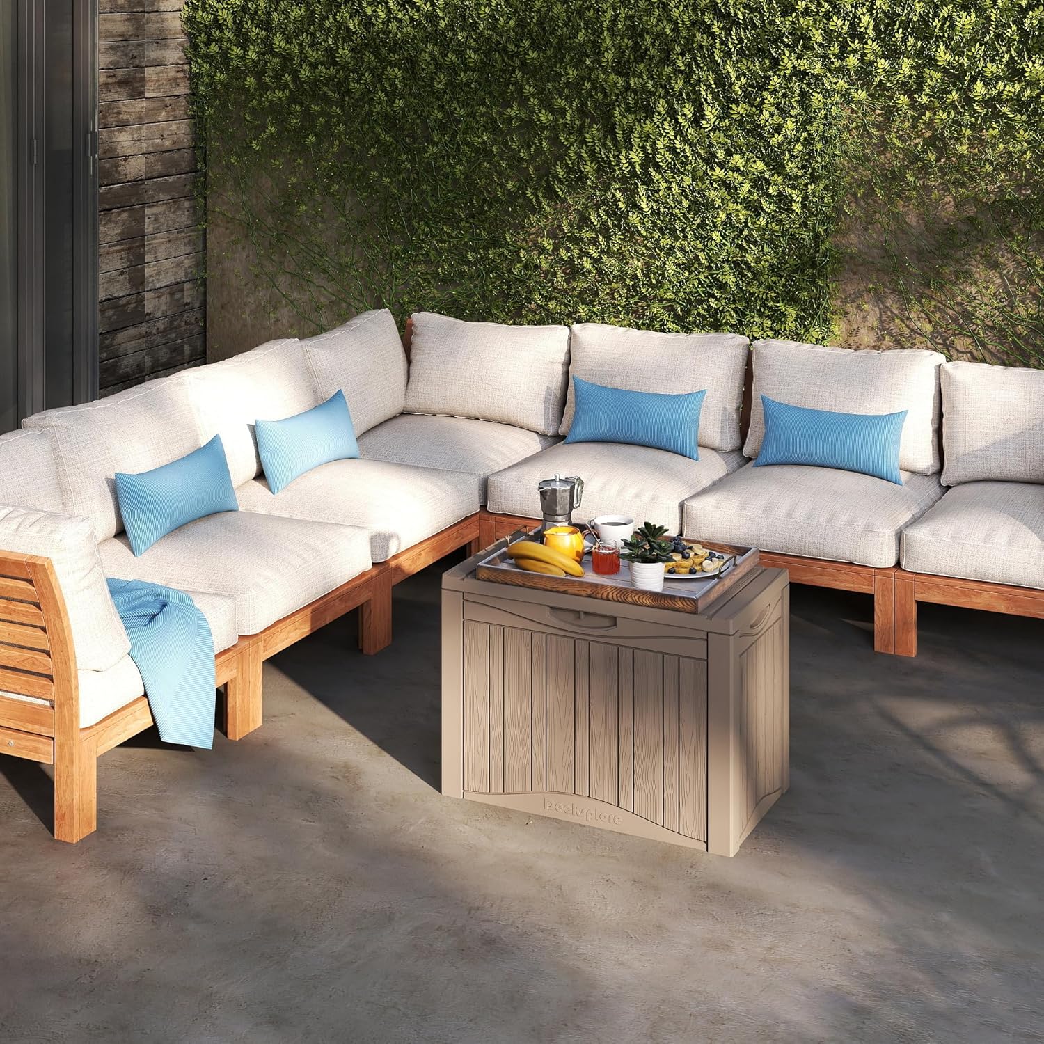 - Both stylish and functional, this patio storage box blends seamlessly with any outdoor decor. Whether your space is modern or classic in style, it will add a sense of sophistication while providing ample storage. Its clean, timeless design enhances the look of your patio, pool area or even indoor space, making it the perfect combination of form and function.