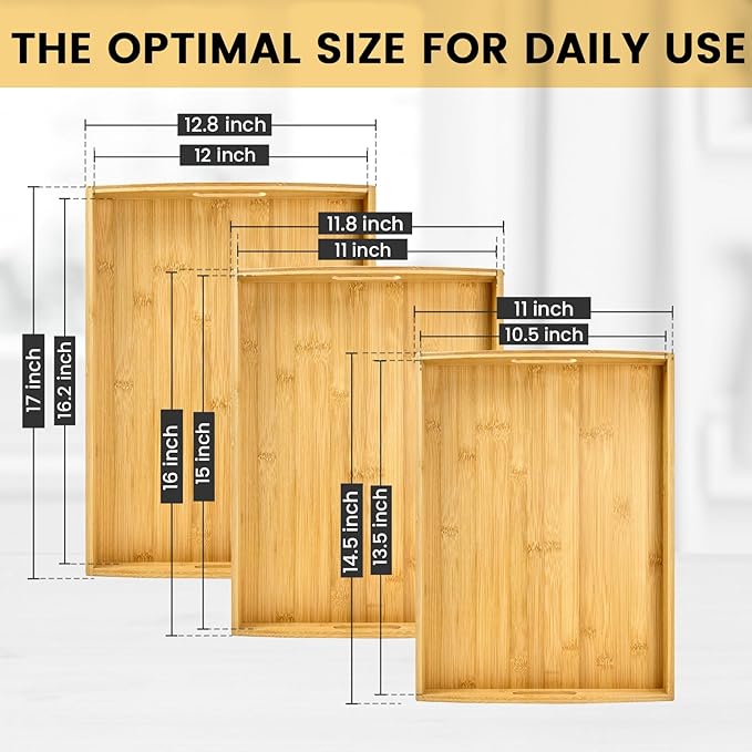 - 3 SIZES: Each set of wooden trays comes in 3 sizes. The large one (17" Γ 13" Γ 1.5") is perfect for displaying items or serving appetizers; the medium one (16" Γ 12" Γ 1.5") fits small spaces or coffee tables; and the small one (14.5" Γ 11" Γ 1.5") is stackable to save space.
