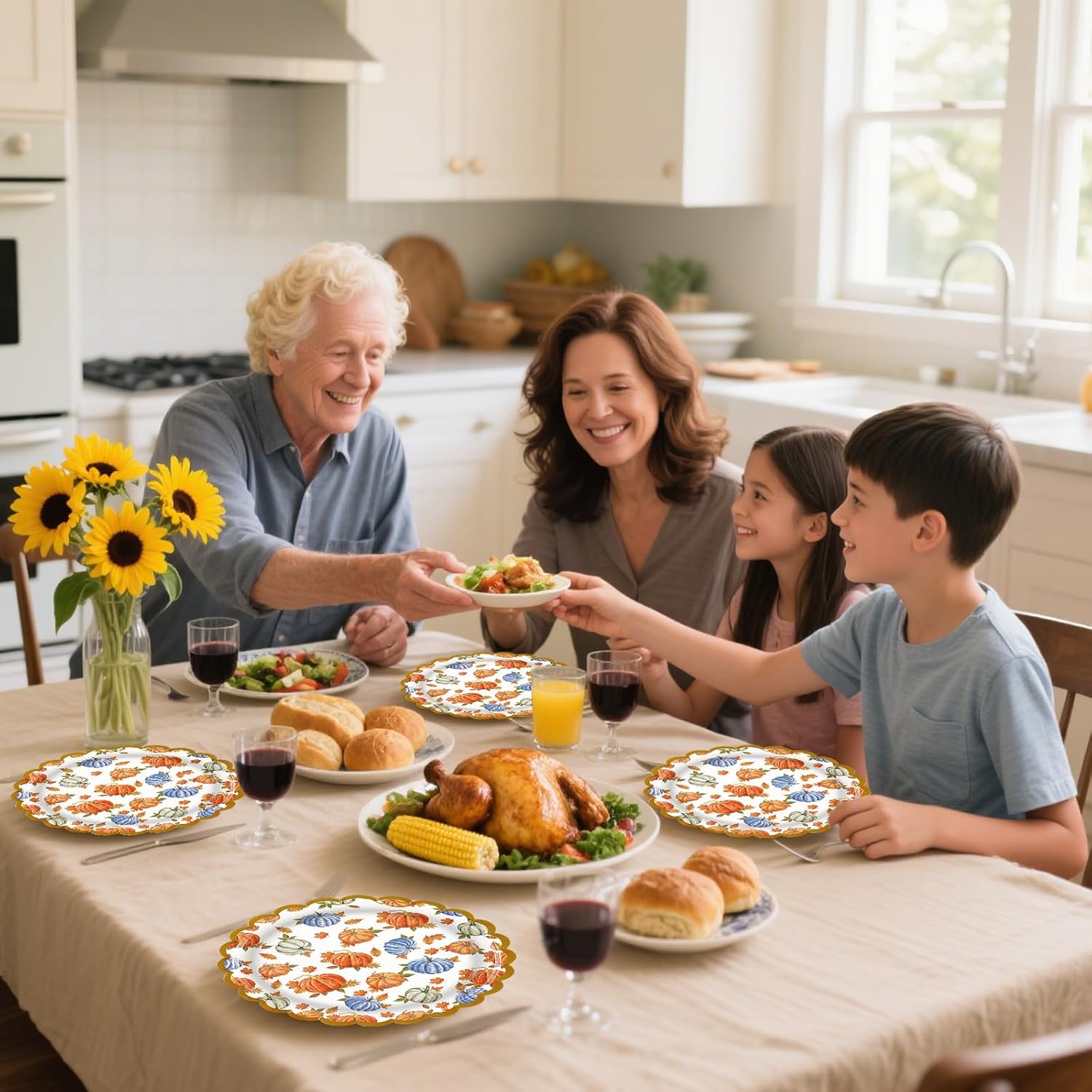 - 【VINTAGE & ELEGANT DESIGN】: These fall - themed paper plates feature a delightful design with various pumpkins in shades of orange, blue, and green, along with autumn leaves. Vintage fall plates have a charming gold scalloped edge, adding a touch of elegance. Perfect for fall - themed parties, gatherings, or Thanksgiving celebrations, they bring a warm and festive autumnal atmosphere to any occasion.