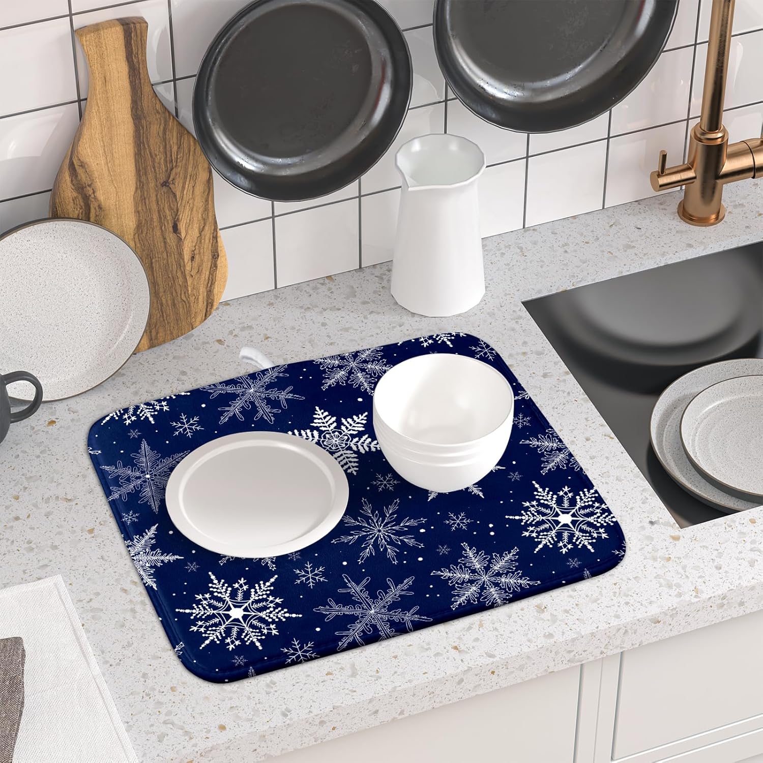 Winter blue Snowflake Dish Drying Mat for Kitchen Counter Holiday Super Absorbent Reversible Microfiber Kitchen Countertop Protector Dishes Pad Small 16x18 inch