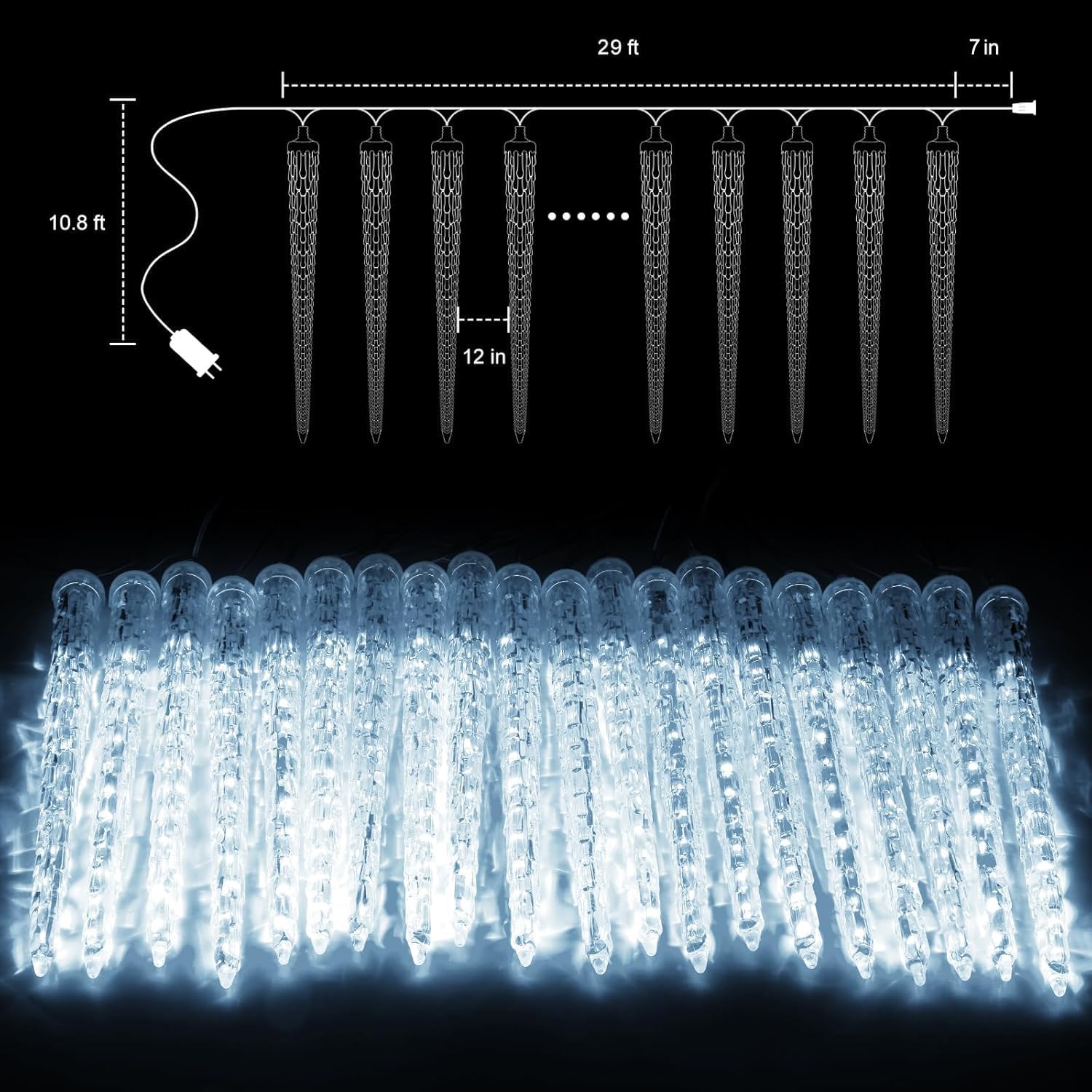 - 【Crystal Christmas Icicle Lights】Each Pack dazzle with 30 crystal icicle tubes featuring 720 pure white LEDs. The 11-inch icicles with a classic ice crystal design transform your yard into a magical winter wonderland;