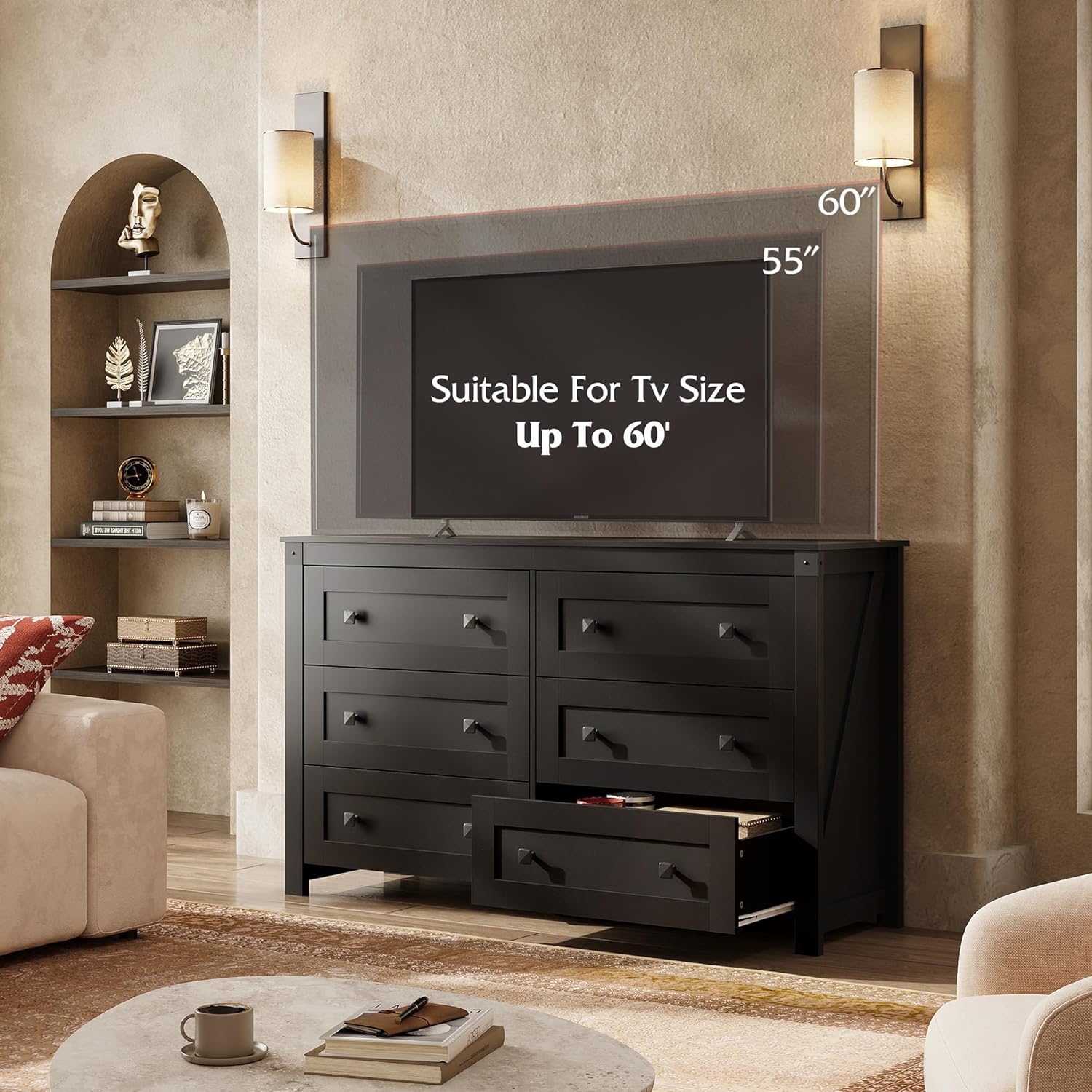 WLIVE Farmhouse Black Dresser for Bedroom, 53.07'' Wide 6 Drawer Wood Dresser, Chest of Drawers with Double Rustic Handle, TV Stand for 60 inch TV, Modern Clothes Organizer for Living Room, Hallway