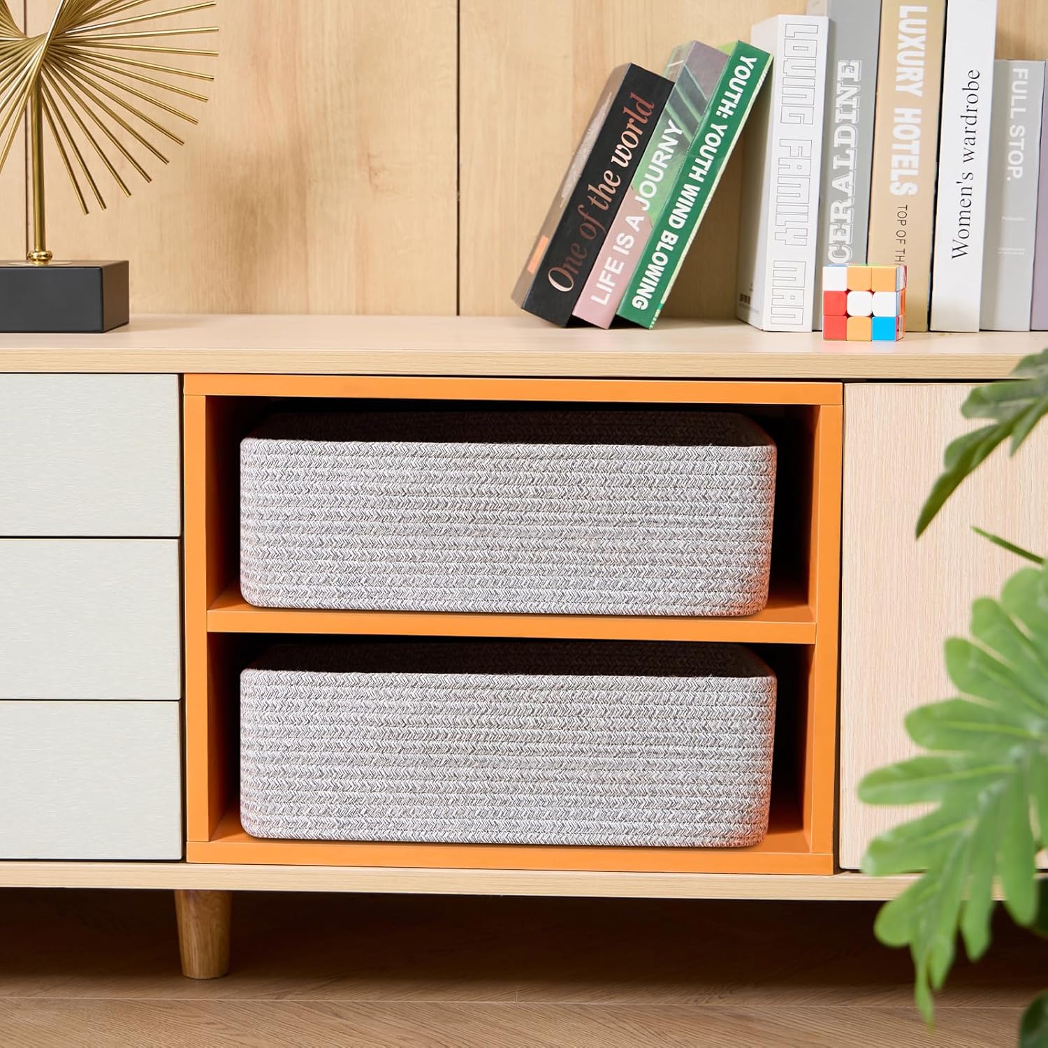 Large Shallow Organizing Baskets 15x11x5.1 Inches - Rope Woven Storage Bins for Bathroom, Shelves, Cube Closet, Mixed Grey 2 Packs