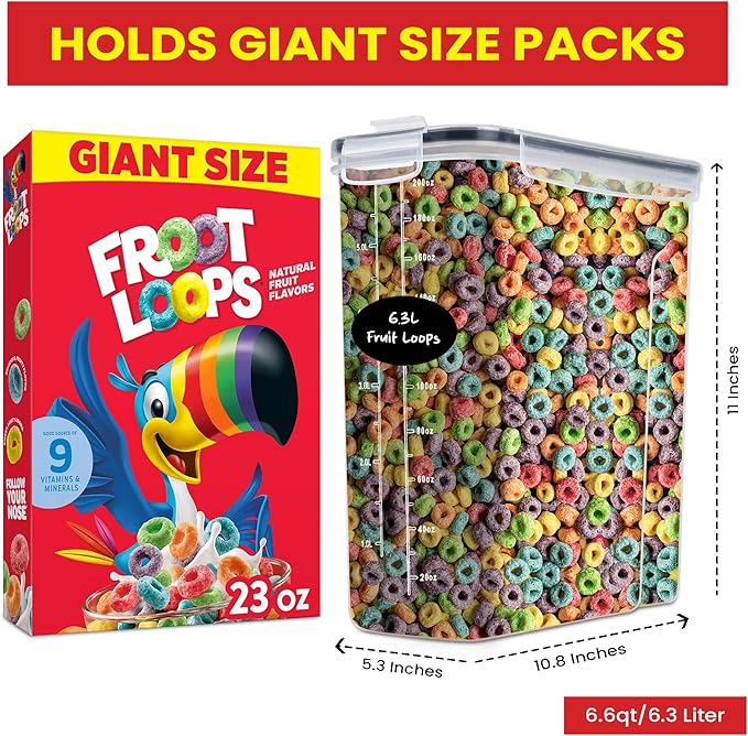 - Bulk Storage: These large food storage containers with lids are designed to hold mega-size cereal boxes and more each cereal container holds 6.6 qt/6.3 liter.