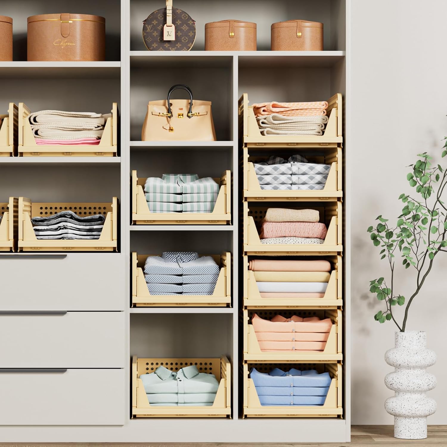 5 Pack Stackable Closet Storage Basket - Stackable Storage Bins, Multifunctional & Foldable Closet Organizer, Wardrobe Cupboard Space-Saving Hat Storage Drawer Organizer, Yellow