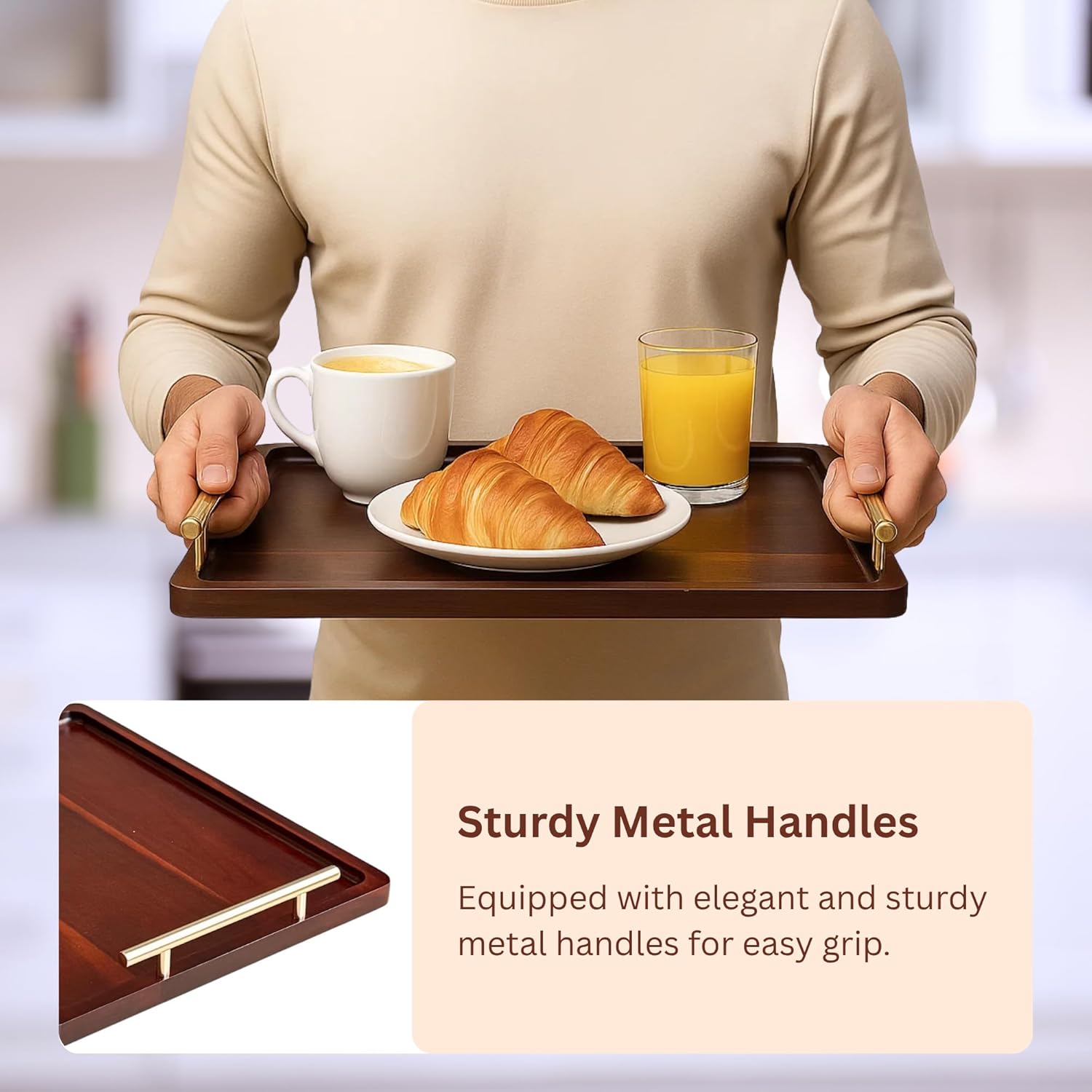 - Metal Handles and Anti-Slip Feet: Our serving tray for ottoman is designed to be both aesthetic and practical. That’s why the wooden serving tray has a lightweight and sturdy construction equipped with durable metal handles for easy carrying and anti-slip rubber feet that prevent the tray from damaging your surfaces.