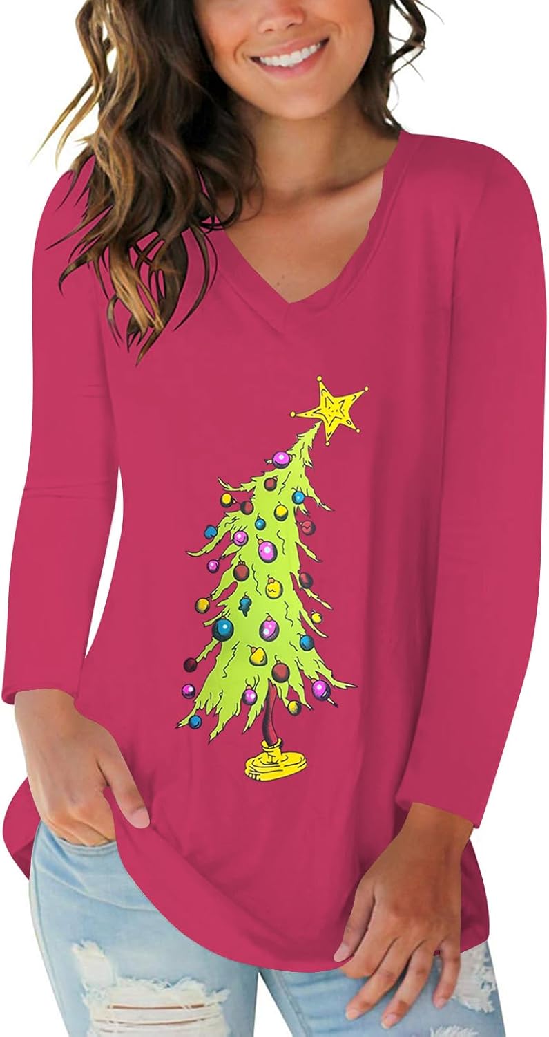 Tobrief Women's Long Sleeve V-Neck Shirts Fall Graphic Tees Loose Casual T-Shirt