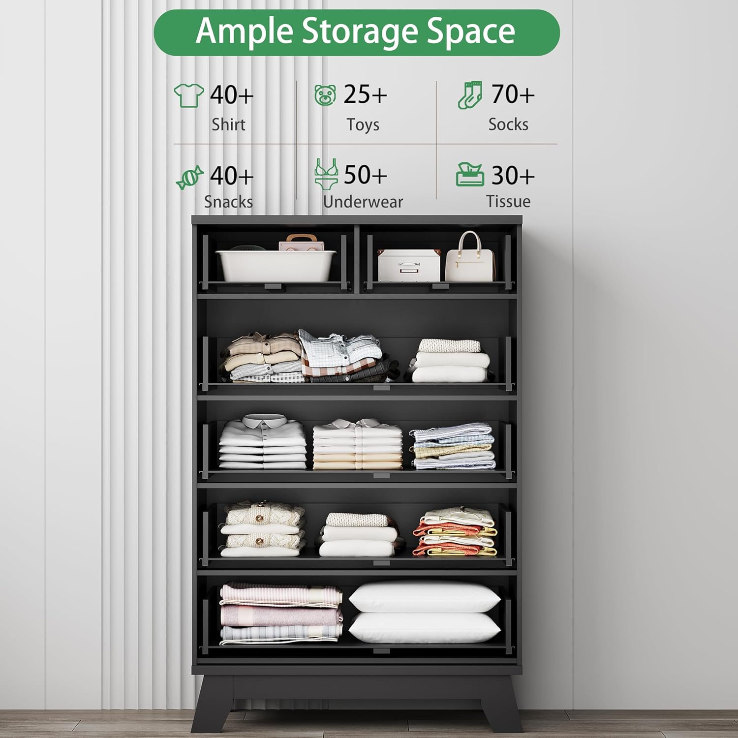 - ăLarge Storage CapacityăThe dresser for closet features 2+4 deep drawers that provide plenty of room for organizing clothing, bedding, cosmetics, or jewelry, helping you maintain a neat and tidy space. The wide wooden tabletop can serve as a dresser TV stand or display your decorations such as photo frames, plants or mirrors. Perfect for bedroom, living room, hallway, entryway