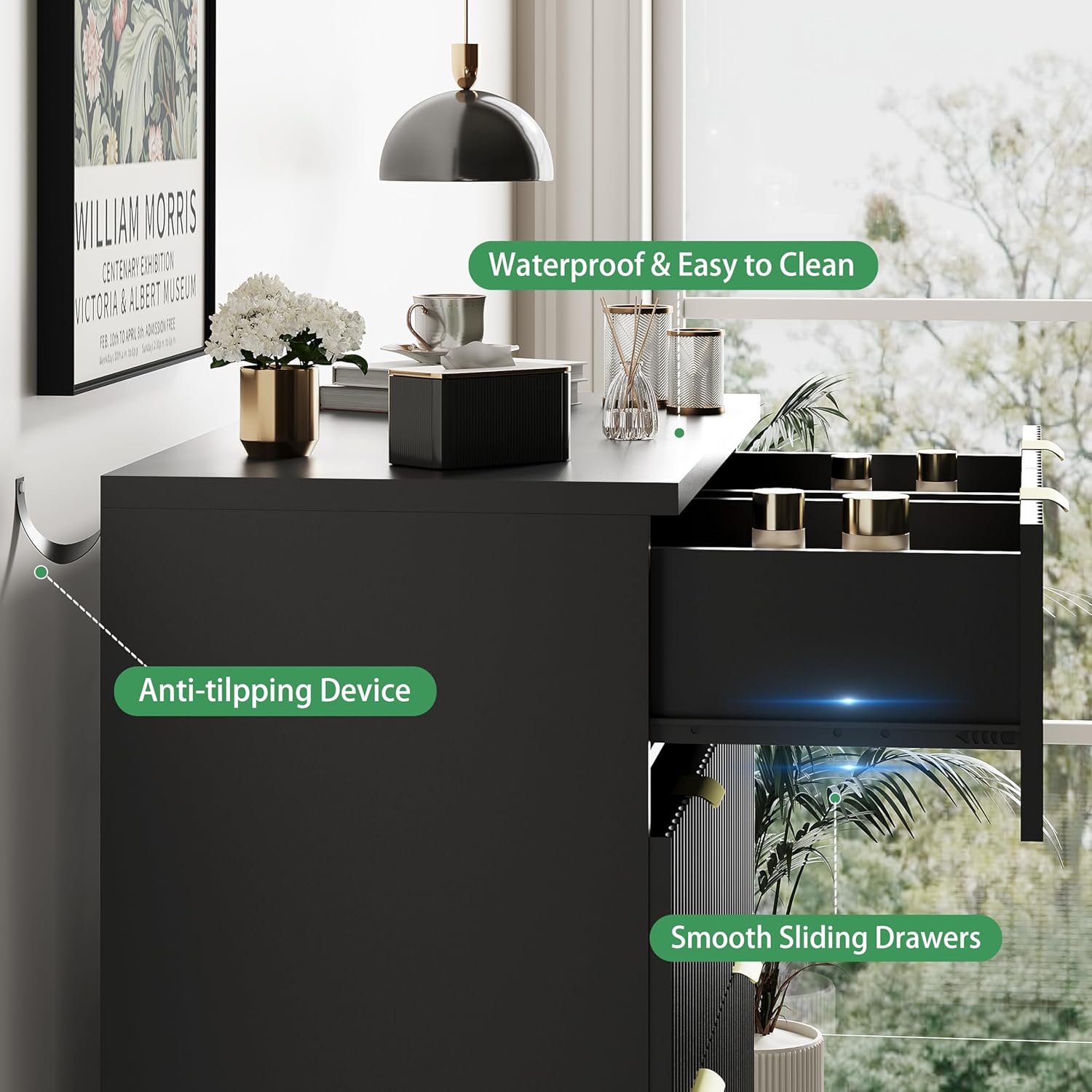- ăStability & SafetyăThe white/black/natural oak/grey dresser is equipped with an anti-tipping device, which can be fixed on the wall to prevent accidents. Each drawer contains a wide metal handle and built-in slide rail, easy to push and pull. Besides, the sturdy base provides this dresser with drawers a strong support and the middle feet can be adjustable to keep balance on uneven floors