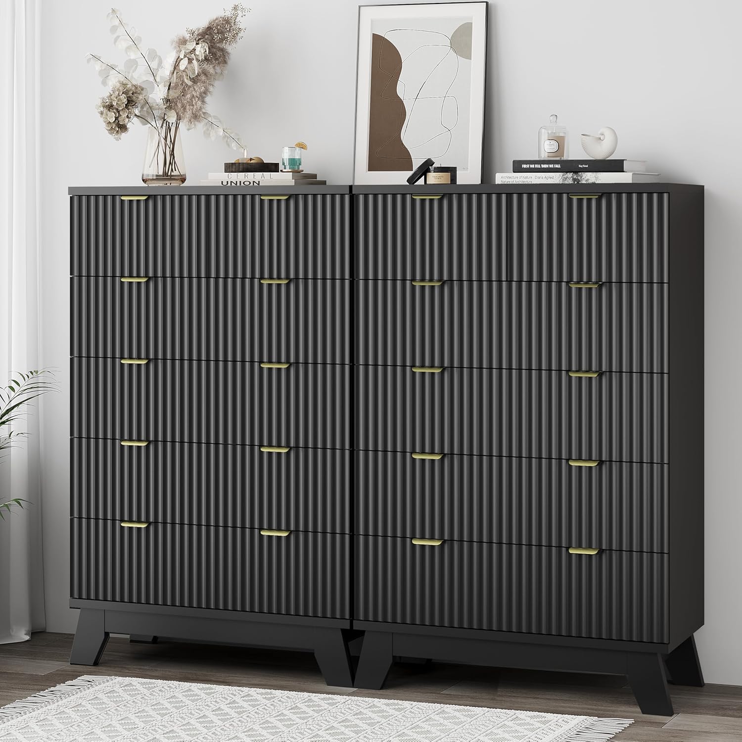 - ăModern Chic AppearanceăThe unique wave-like fluted panel enhances the texture and elegance of this bedroom dresser. The thick table top features natural wood grain that complements the black finish. The wide metal handle and splayed base legs add a modern touch, creating a personalized and distinctive appearance