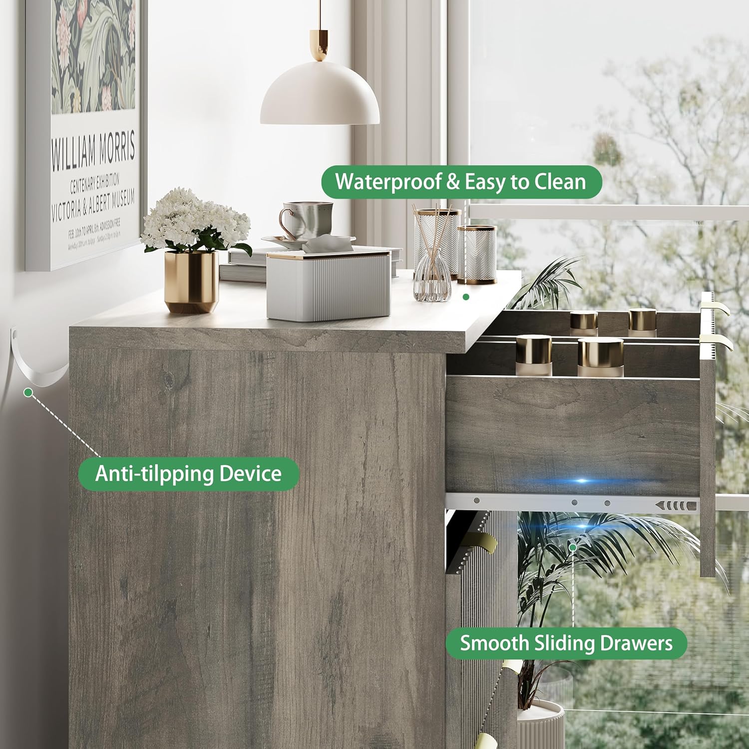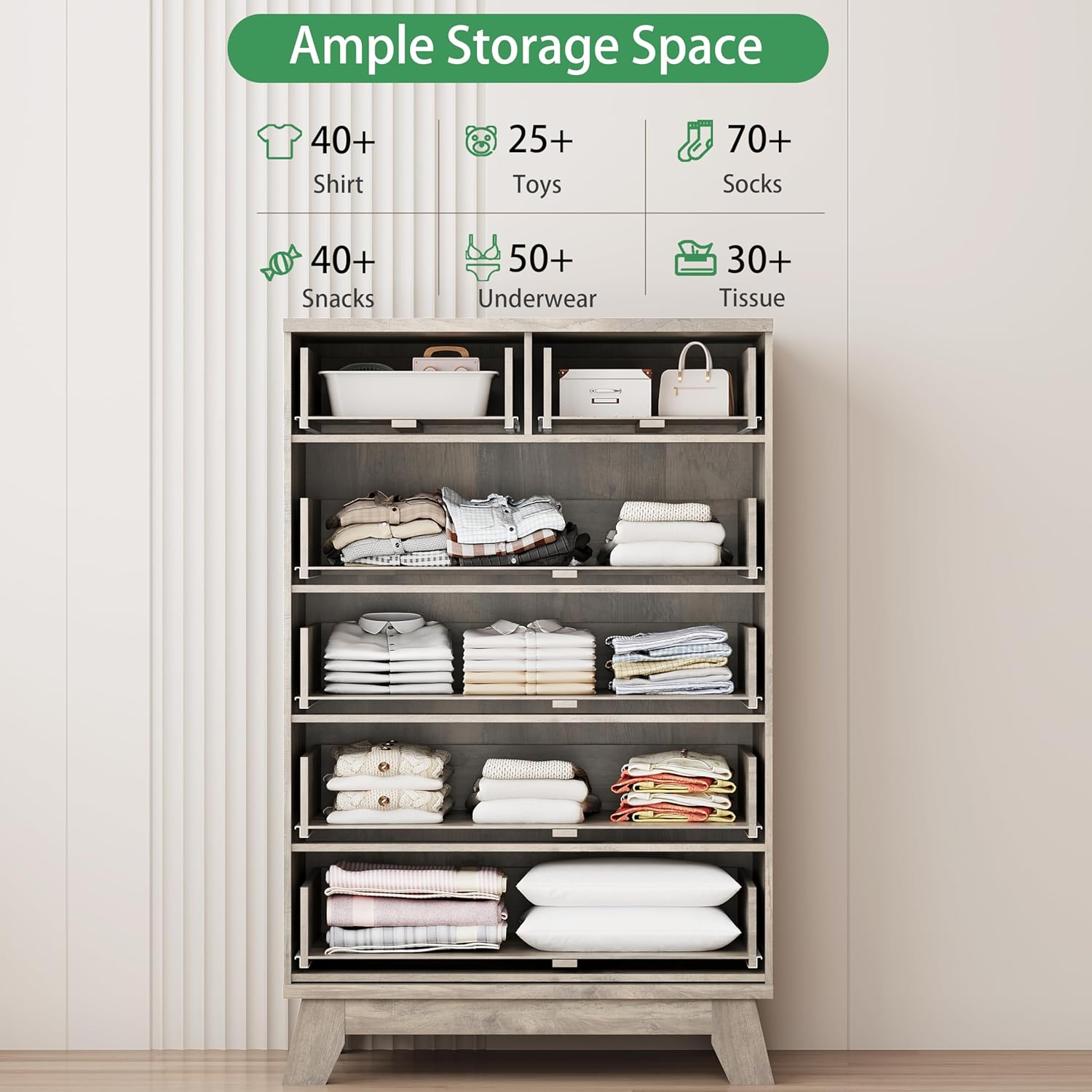 - ăStability & SafetyăThe white/black/natural oak/grey dresser is equipped with an anti-tipping device, which can be fixed on the wall to prevent accidents. Each drawer contains a wide metal handle and built-in slide rail, easy to push and pull. Besides, the sturdy base provides this dresser with drawers a strong support and the middle feet can be adjustable to keep balance on uneven floors