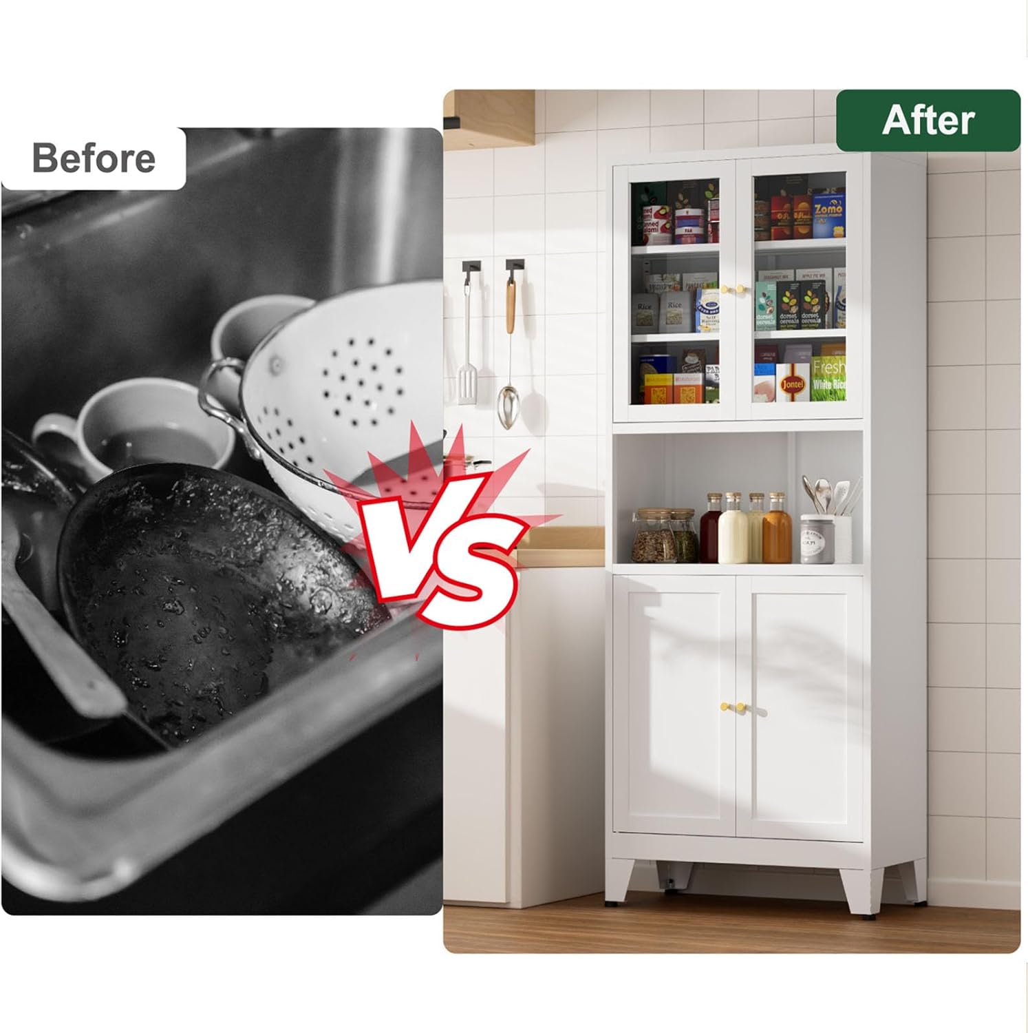 - Multi-functional Applications: The metal pantry cabinet with 4 magnetic doors and adjustable shelves, you can adjust the height of the shelves to suit the storage needs of different sized items. This cabinet is suitable for kitchen, dining room, living room, bathroom and also can be used as a bookcase